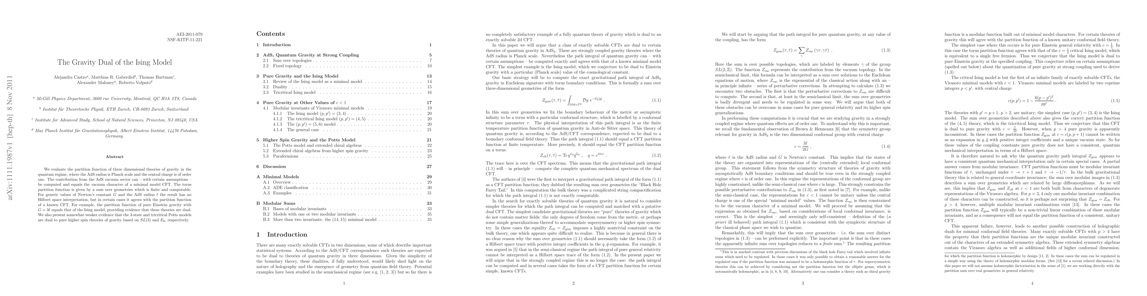 We evaluate the partition function of three dimensional theories of gravity in the quantum regime, where the AdS radius is Planck scale and the central charge is of order one. The contribution from the AdS vacuum sector can - with certain assumptions - be computed and equals the vacuum character of a minimal model CFT. The torus partition function is given by a sum over geometries which is finite and computable. For generic values of Newton's constant G and the AdS radius L the result has no Hilbert space interpretation, but in certain cases it agrees with the partition function of a known CFT. For example, the partition function of pure Einstein gravity with G=3L equals that of the Ising model, providing evidence that these theories are dual. We also present somewhat weaker evidence that the 3-state and tricritical Potts models are dual to pure higher spin theories of gravity based on SL(3) and E_6, respectively.