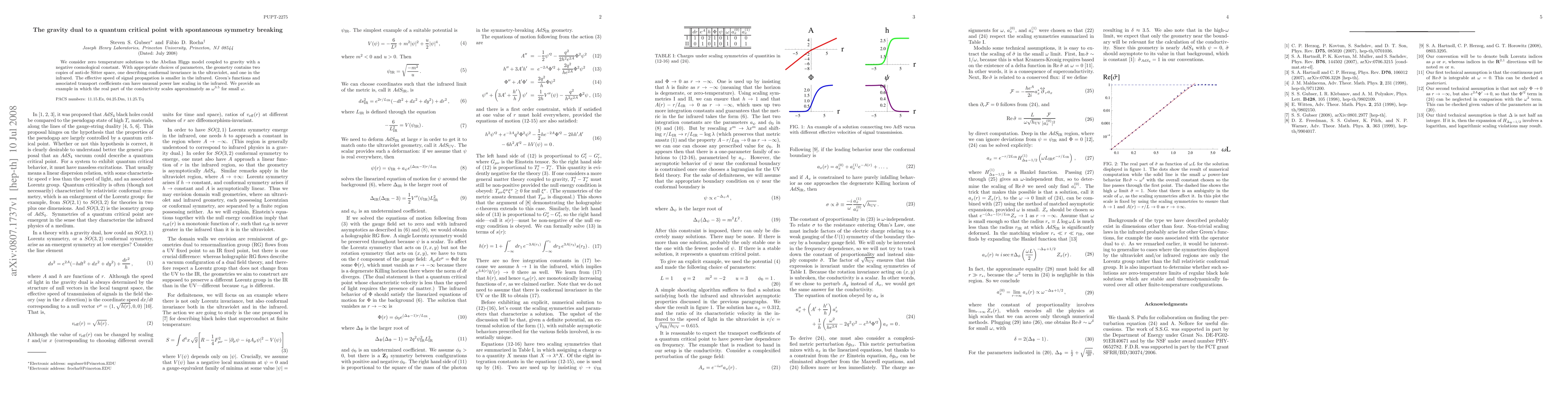 We consider zero temperature solutions to the Abelian Higgs model coupled to gravity with a negative cosmological constant. With appropriate choices of parameters, the geometry contains two copies of anti-de Sitter space, one describing conformal invariance in the ultraviolet, and one in the infrared. The effective speed of signal propagation is smaller in the infrared. Green's functions and associated transport coefficients can have unusual power law scaling in the infrared. We provide an example in which the real part of the conductivity scales approximately as omega^3.5 for small omega.