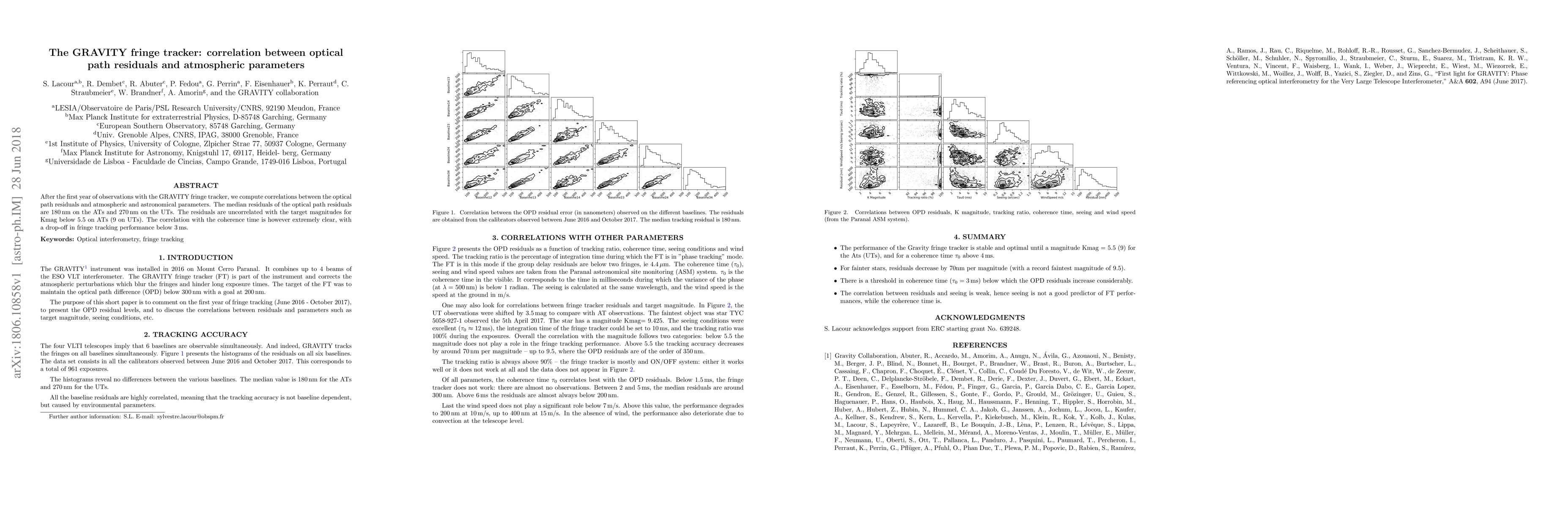 After the first year of observations with the GRAVITY fringe tracker, we compute correlations between the optical path residuals and atmospheric and astronomical parameters. The median residuals of the optical path residuals are 180 nm on the ATs and 270 nm on the UTs. The residuals are uncorrelated with the target magnitudes for Kmag below 5.5 on ATs (9 on UTs). The correlation with the coherence time is however extremely clear, with a drop-off in fringe tracking performance below 3 ms.