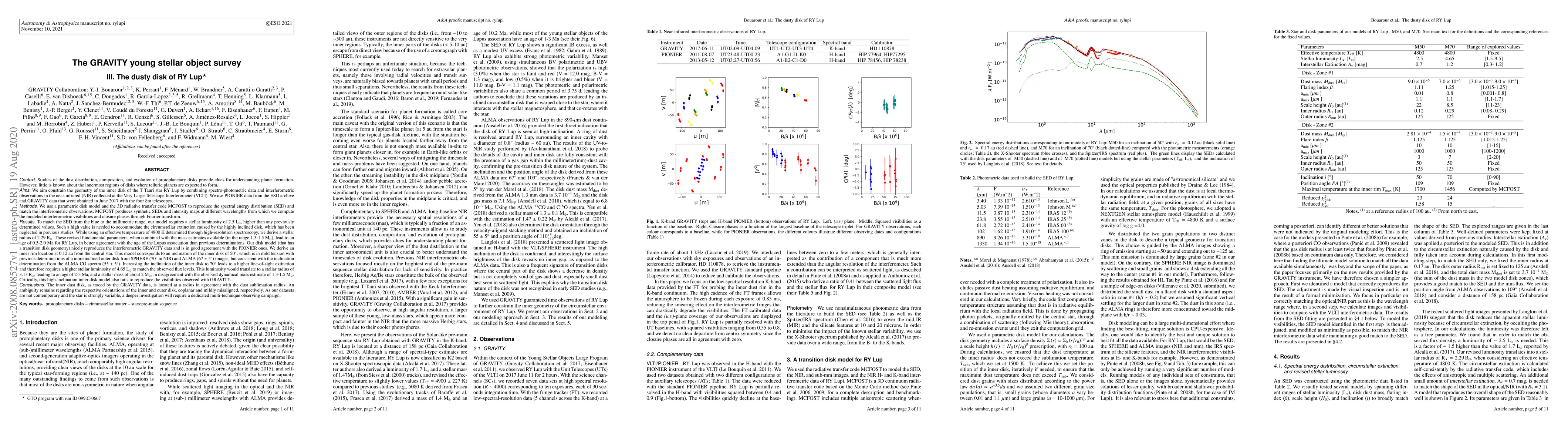 We use PIONIER data from the ESO archive and GRAVITY data that were obtained in June 2017 with the four 8m telescopes. We use a parametric disk model and the 3D radiative transfer code MCFOST to reproduce the Spectral Energy Distribution and match the interferometric observations. To match the SED , our model requires a stellar luminosity of 2.5 Lsun, higher than any previously determined values. Such a high value is needed to accommodate the circumstellar extinction caused by the highly inclined disk, which has been neglected in previous studies. While using an effective temperature of 4800 K determined through high-resolution spectroscopy, we derive a stellar radius of 2.29 Rsun. These revised fundamental parameters, when combined with the mass estimates available , lead to an age of 0.5-2.0 Ma for RY Lup, in better agreement with the age of the Lupus association than previous determinations. Our disk model nicely reproduces the interferometric GRAVITY data and is in good agreement with the PIONIER ones. We derive an inner rim location at 0.12~au from the central star. This model corresponds to an inclination of the inner disk of 50deg, which is in mild tension with previous determinations of a more inclined outer disk from SPHERE (70 deg in NIR) and ALMA(67 $\pm$5 deg) images, but consistent with the inclination determination from the ALMA CO spectra (55$\pm$5deg). Increasing the inclination of the inner disk to 70 deg leads to a higher line-of-sight extinction and therefore requires a higher stellar luminosity of 4.65 Lsun to match the observed flux levels. This luminosity would translate to a stellar radius of 3.13~Rsun, leading to an age of 2-3~Ma, and a stellar mass of about 2 Msun, in disagreement with the observed dynamical mass estimate of 1.3-1.5 Msun. Critically, this high-inclination inner disk model also fails to reproduce the visibilities observed with GRAVITY.
