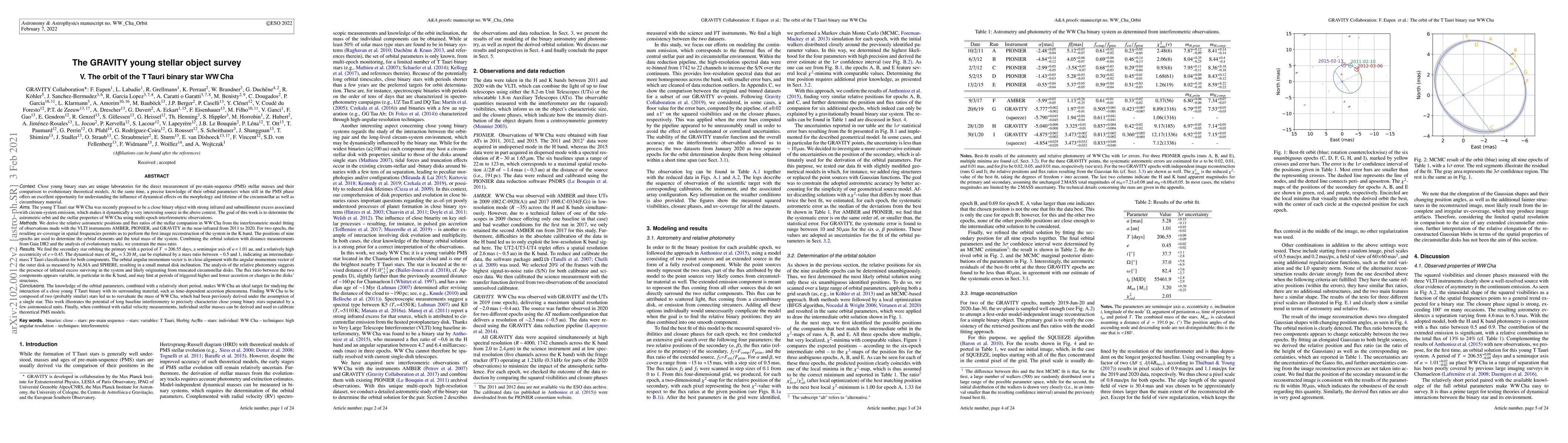 The young T Tauri star WW Cha was recently proposed to be a close binary object with strong infrared and submillimeter excess associated with circum-system emission. This makes WW Cha a very interesting source for studying the influence of dynamical effects on circumstellar as well as circumbinary material. We derive the relative astrometric positions and flux ratios of the stellar companion in WW Cha from the interferometric model fitting of observations made with the VLTI instruments AMBER, PIONIER, and GRAVITY in the near-infrared from 2011 to 2020. For two epochs, the resulting uv-coverage in spatial frequencies permits us to perform the first image reconstruction of the system in the K band. The positions of nine epochs are used to determine the orbital elements and the total mass of the system. We find the secondary star orbiting the primary with a period of T=206.55 days, a semimajor axis of a=1.01 au, and a relatively high eccentricity of e=0.45. Combining the orbital solution with distance measurements from Gaia DR2 and the analysis of evolutionary tracks, the dynamical mass of Mtot=3.20 Msol can be explained by a mass ratio between ~0.5 and 1. The orbital angular momentum vector is in close alignment with the angular momentum vector of the outer disk as measured by ALMA and SPHERE. The analysis of the relative photometry suggests the presence of infrared excess surviving in the system and likely originating from truncated circumstellar disks. The flux ratio between the two components appears variable, in particular in the K band, and may hint at periods of triggered higher and lower accretion or changes in the disks' structures. The knowledge of the orbital parameters, combined with a relatively short period, makes WW Cha an ideal target for studying the interaction of a close young T Tauri binary with its surrounding material, such as time-dependent accretion phenomena.