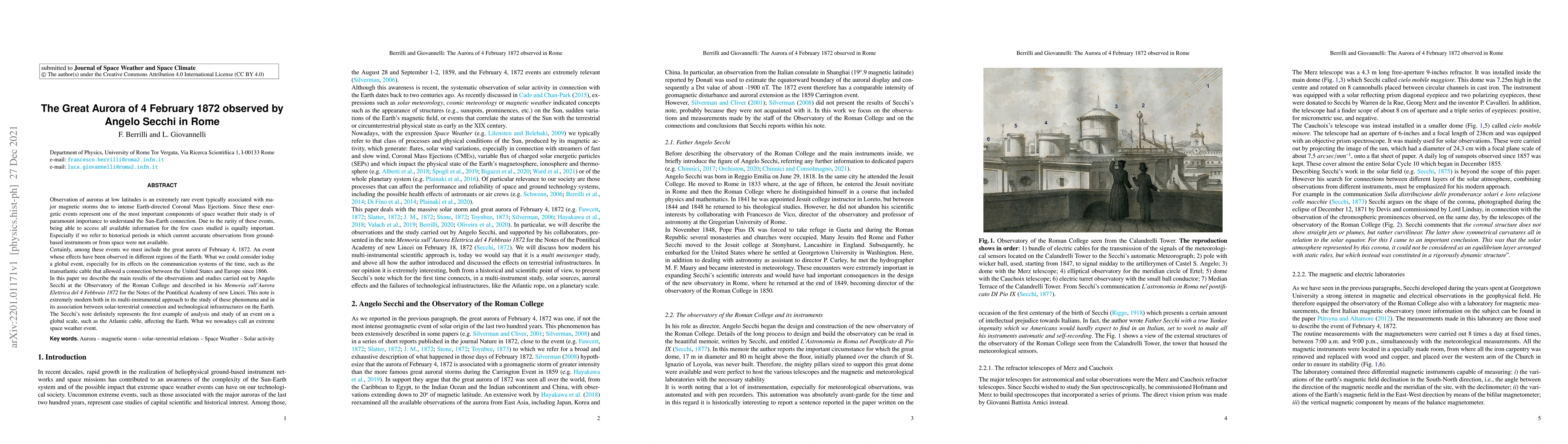 This paper details Angelo Secchi's observations of the rare February 4, 1872 aurora, emphasizing its global impact and its effects on communication systems like the transatlantic cable. Secchi's analysis represents a pioneering study of extreme space weather and its connection to solar activity.