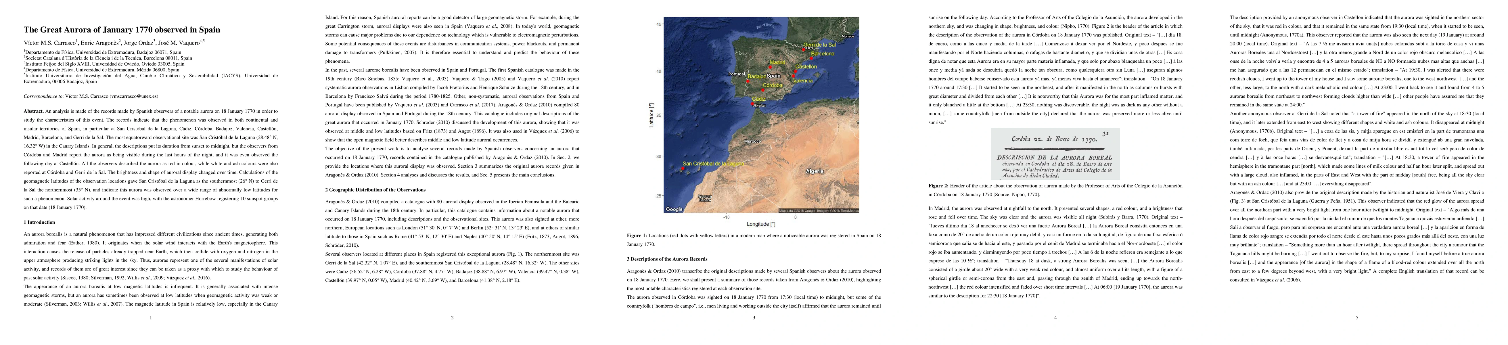 The paper analyzes Spanish records from 18 January 1770, detailing a prominent aurora observed across Spain, from the Canary Islands to the mainland. The aurora, described as predominantly red but with white and ash hues, lasted from sunset to midnight, and even into the next day in some locations. Its low-latitude visibility, coupled with high solar activity marked by 10 sunspot groups, suggests an unusually intense geomagnetic event.