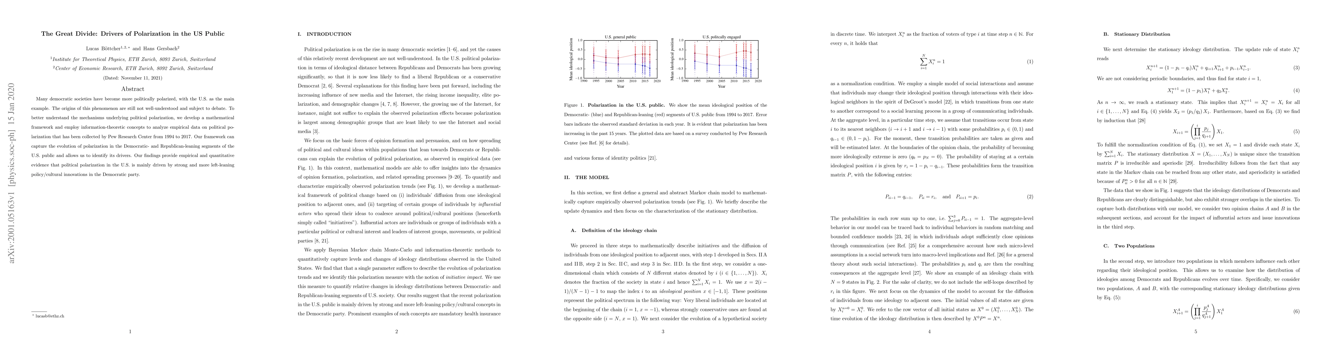 Many democratic societies have become more politically polarized, with the U.S. as the main example. The origins of this phenomenon are still not well-understood and subject to debate. To better understand the mechanisms underlying political polarization, we develop a mathematical framework and employ information-theoretic concepts to analyze empirical data on political polarization that has been collected by Pew Research Center from 1994 to 2017. Our framework can capture the evolution of polarization in the Democratic- and Republican-leaning segments of the U.S. public and allows us to identify its drivers. Our findings provide empirical and quantitative evidence that political polarization in the U.S. is mainly driven by strong and more left-leaning policy/cultural innovations in the Democratic party.