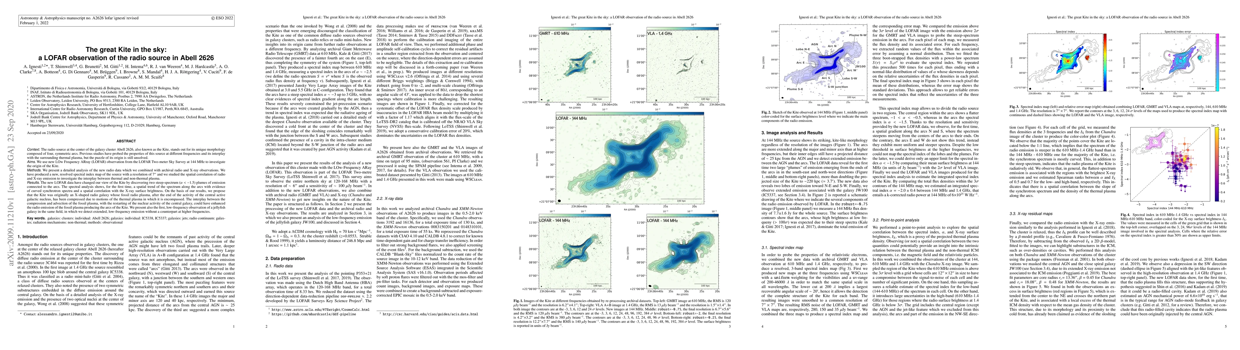 The radio source at the center of the galaxy cluster Abell 2626, also known as the Kite, stands out for its unique morphology composed of four, symmetric arcs. Previous studies have probed the properties of this source at different frequencies and its interplay with the surrounding thermal plasma, but the puzzle of its origin is still unsolved. We use new LOw Frequency ARray (LOFAR) observation from the LOFAR Two-meter Sky Survey at 144 MHz to investigate the origin of the Kite.} We present a detailed analysis of the new radio data which we combined with archival radio and X-ray observations. We have produced a new, resolved spectral index map of the source with a resolution of 7$''$ and we studied the spatial correlation of radio and X-ray emission to investigate the interplay between thermal and non-thermal plasma. The new LOFAR data have changed our view of the Kite by discovering two steep-spectrum ($\alpha<-1.5$) plumes of emission connected to the arcs. The spectral analysis shows, for the first time, a spatial trend of the spectrum along the arcs with evidence of curved synchrotron spectra and a spatial correlation with the X-ray surface brightness. On the basis of our results, we propose that the Kite was originally an X-shaped radio galaxy whose fossil radio plasma, after the end of the activity of the central active galactic nucleus, has been compressed due to motions of the thermal plasma in which it is encompassed. The interplay between the compression and advection of the fossil plasma, with the restarting of the nuclear activity of the central galaxy, could have enhanced the radio emission of the fossil plasma producing the arcs of the Kite. We present also the first, low-frequency observation of a jellyfish galaxy in the same field, in which we detect extended, low-frequency emission without a counterpart at higher frequencies.