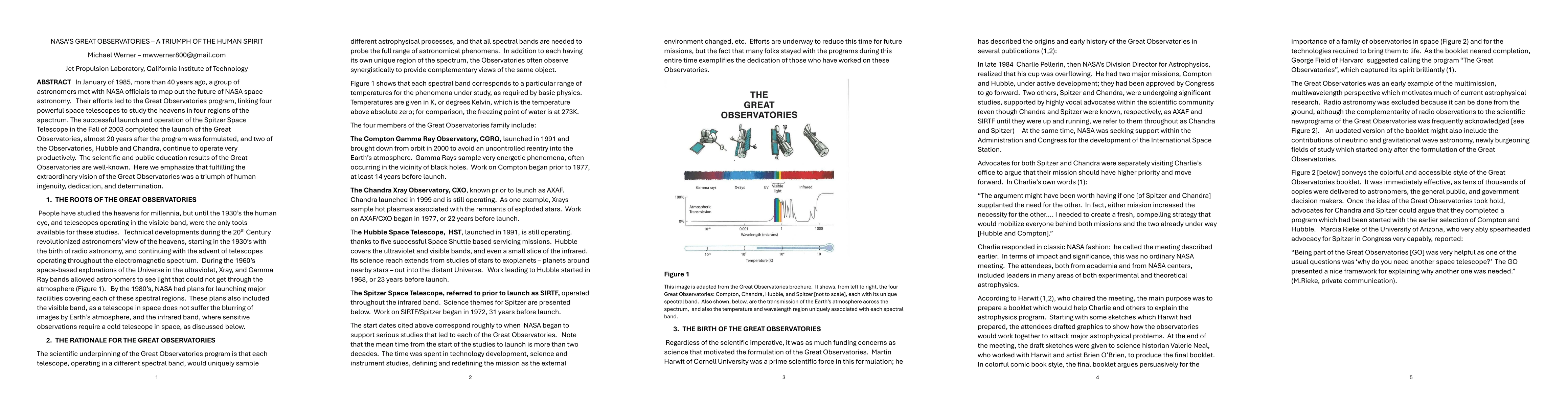 In January of 1985, more than 40 years ago, a group of astronomers met with NASA officials to map out the future of NASA space astronomy. Their efforts led to the Great Observatories program, linking four powerful space telescopes to study the heavens in four regions of the spectrum. The successful launch and operation of the Spitzer Space Telescope in the Fall of 2003 completed the launch of the Great Observatories, almost 20 years after the program was formulated, and two of the Observatories, Hubble and Chandra, continue to operate very productively. The scientific and public education results of the Great Observatories are well-known. Here we emphasize that fulfilling the extraordinary vision of the Great Observatories was a triumph of human ingenuity, dedication, and determination.