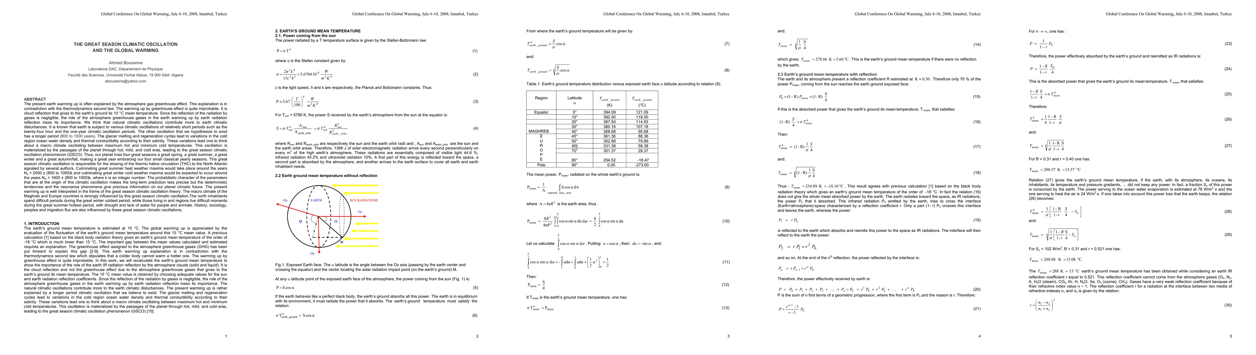 The present earth warming up is often explained by the atmosphere gas greenhouse effect. This explanation is in contradiction with the thermodynamics second law. The warming up by greenhouse effect is quite improbable. It is cloud reflection that gives to the earth s ground its 15 degres C mean temperature. Since the reflection of the radiation by gases is negligible, the role of the atmosphere greenhouse gases in the earth warming up by earth radiation reflection loses its importance. We think that natural climatic oscillations contribute more to earth climatic disturbances. The oscillation that we hypothesize to exist has a long period (800 to 1000 years). The glacier melting and regeneration cycles lead to variations in the cold region ocean water density and thermal conductibility according to their salinity. These variations lead one to think about a macro climate oscillating between maximum hot and minimum cold temperatures. This oscillation is materialized by the passages of the planet through hot, mild, and cold eras, leading to the great season climatic oscillation phenomenon (GSCO). Thus, our planet lives four great seasons a great spring, a great summer, a great winter and a great autumn/fall, making a great year embracing our four small classical yearly seasons. The probabilistic character of the parameters that are at the origin of this climatic oscillation makes the long-term prediction less precise but the deterministic tendencies and the resonance phenomena give precious information on our planet climatic future. The present warming up is well interpreted in the frame of the great season climatic oscillation theory.