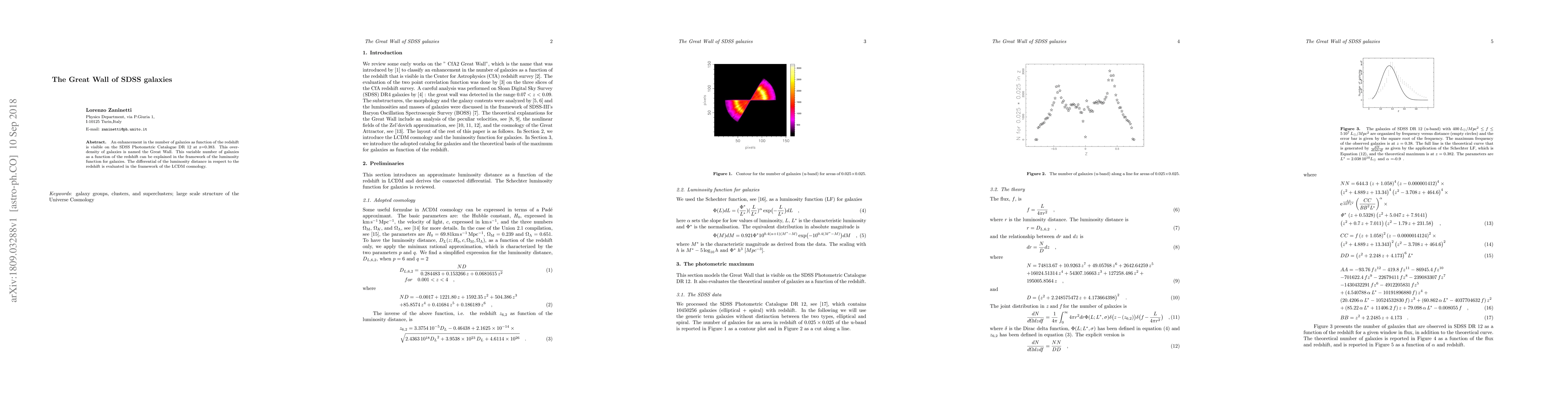 An enhancement in the number of galaxies as function of the redshift is visible on the SDSS Photometric Catalogue DR 12 at z=0.383. This over-density of galaxies is named the Great Wall. This variable number of galaxies as a function of the redshift can be explained in the framework of the luminosity function for galaxies. The differential of the luminosity distance in respect to the redshift is evaluated in the framework of the LCDM cosmology.