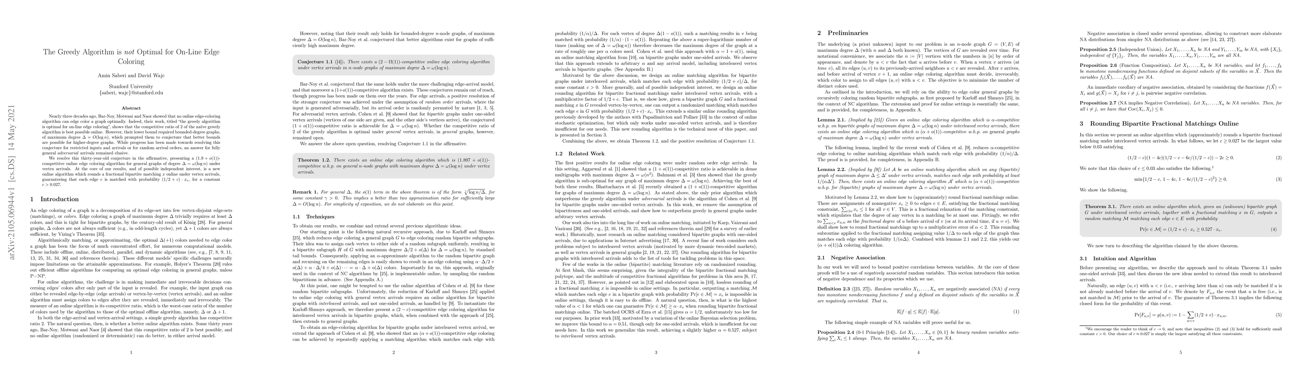 Nearly three decades ago, Bar-Noy, Motwani and Naor showed that no online edge-coloring algorithm can edge color a graph optimally. Indeed, their work, titled "the greedy algorithm is optimal for on-line edge coloring", shows that the competitive ratio of $2$ of the na\"ive greedy algorithm is best possible online. However, their lower bound required bounded-degree graphs, of maximum degree $\Delta = O(\log n)$, which prompted them to conjecture that better bounds are possible for higher-degree graphs. While progress has been made towards resolving this conjecture for restricted inputs and arrivals or for random arrival orders, an answer for fully general \emph{adversarial} arrivals remained elusive. We resolve this thirty-year-old conjecture in the affirmative, presenting a $(1.9+o(1))$-competitive online edge coloring algorithm for general graphs of degree $\Delta = \omega(\log n)$ under vertex arrivals. At the core of our results, and of possible independent interest, is a new online algorithm which rounds a fractional bipartite matching $x$ online under vertex arrivals, guaranteeing that each edge $e$ is matched with probability $(1/2+c)\cdot x_e$, for a constant $c>0.027$.
