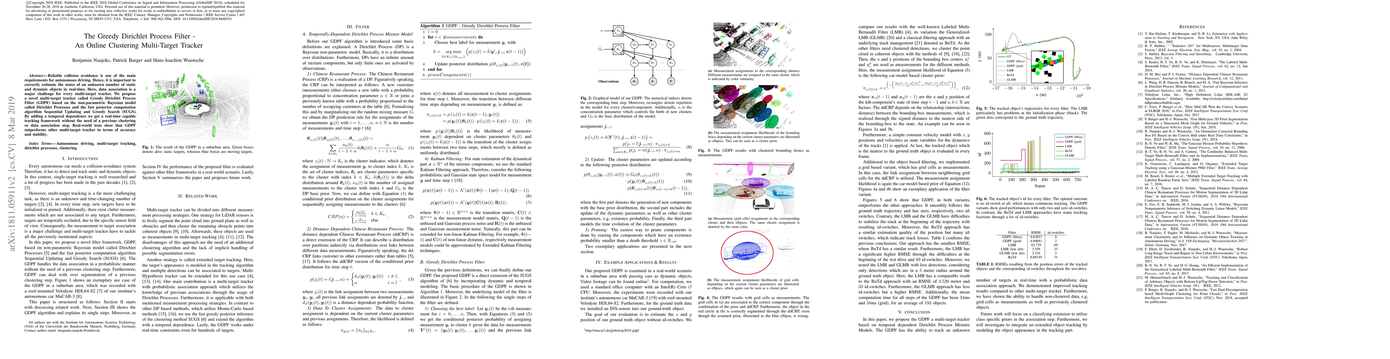 The Greedy Dirichlet Process Filter (GDPF) is a novel multi-target tracker that leverages Dirichlet Processes and the Sequential Updating and Greedy Search algorithm for real-time tracking of static and dynamic objects. It outperforms other trackers in accuracy and stability, eliminating the need for prior clustering or data association.