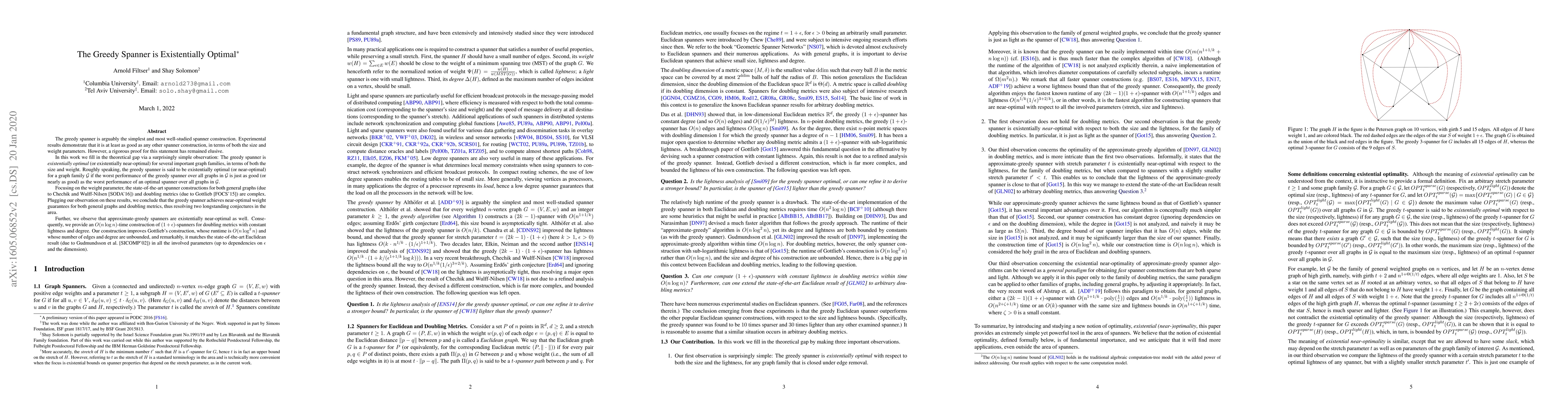 The greedy spanner is proven to be existentially optimal for several graph families in terms of size and weight, resolving two longstanding conjectures, and achieving near-optimal guarantees even for approximate-greedy spanners.