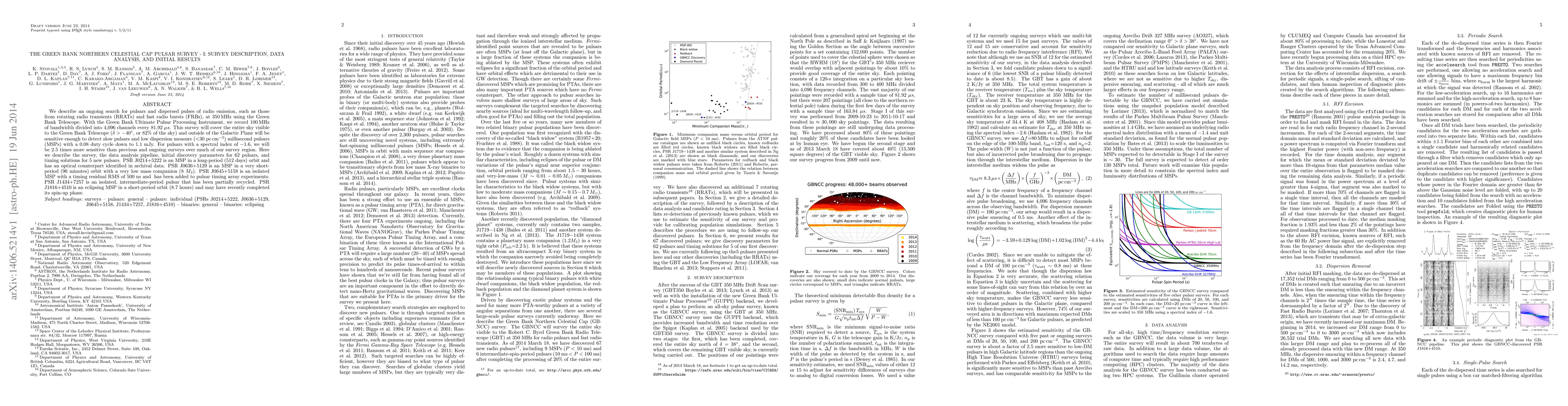 We describe an ongoing search for pulsars and dispersed pulses of radio emission, such as those from rotating radio transients (RRATs) and fast radio bursts (FRBs), at 350 MHz using the Green Bank Telescope. With the Green Bank Ultimate Pulsar Processing Instrument, we record 100 MHz of bandwidth divided into 4,096 channels every 81.92 $\mu s$. This survey will cover the entire sky visible to the Green Bank Telescope ($\delta > -40^\circ$, or 82% of the sky) and outside of the Galactic Plane will be sensitive enough to detect slow pulsars and low dispersion measure ($<$30 $\mathrm{pc\,cm^{-3}}$) millisecond pulsars (MSPs) with a 0.08 duty cycle down to 1.1 mJy. For pulsars with a spectral index of $-$1.6, we will be 2.5 times more sensitive than previous and ongoing surveys over much of our survey region. Here we describe the survey, the data analysis pipeline, initial discovery parameters for 62 pulsars, and timing solutions for 5 new pulsars. PSR J0214$+$5222 is an MSP in a long-period (512 days) orbit and has an optical counterpart identified in archival data. PSR J0636$+$5129 is an MSP in a very short-period (96 minutes) orbit with a very low mass companion (8 $M_\mathrm{J}$). PSR J0645$+$5158 is an isolated MSP with a timing residual RMS of 500 ns and has been added to pulsar timing array experiments. PSR J1434$+$7257 is an isolated, intermediate-period pulsar that has been partially recycled. PSR J1816$+$4510 is an eclipsing MSP in a short-period orbit (8.7 hours) and may have recently completed its spin-up phase.