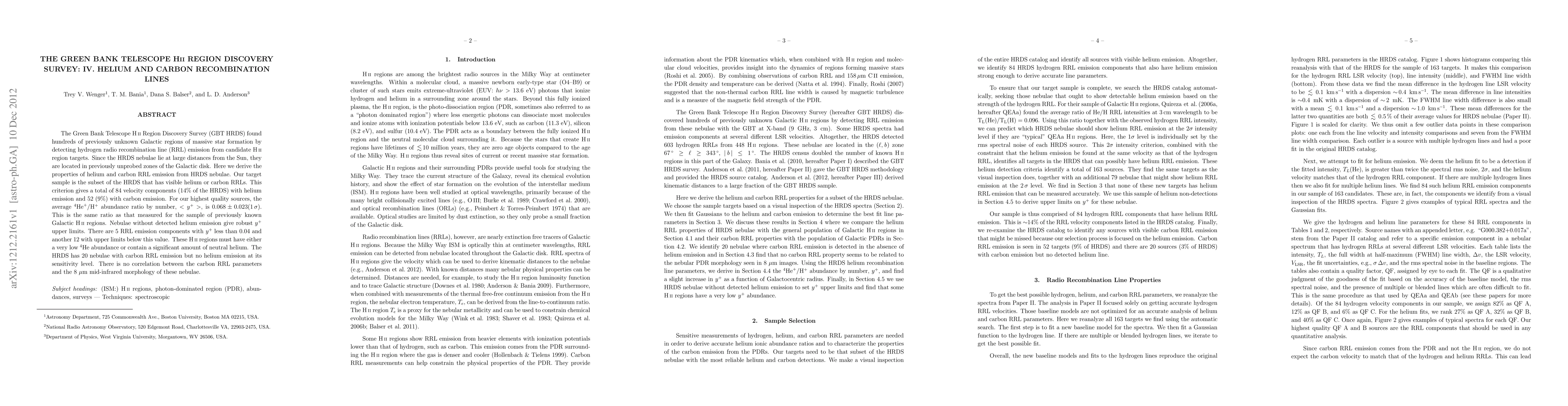 The Green Bank Telescope H II Region Discovery Survey identified previously unknown regions of massive star formation, analyzing helium and carbon recombination lines. The study found that the average ionic He-4+/H+ abundance ratio is 0.068, similar to known Galactic H II regions, with some nebulae showing very low or upper-limit helium abundances, suggesting either low He-4 abundance or significant neutral helium.