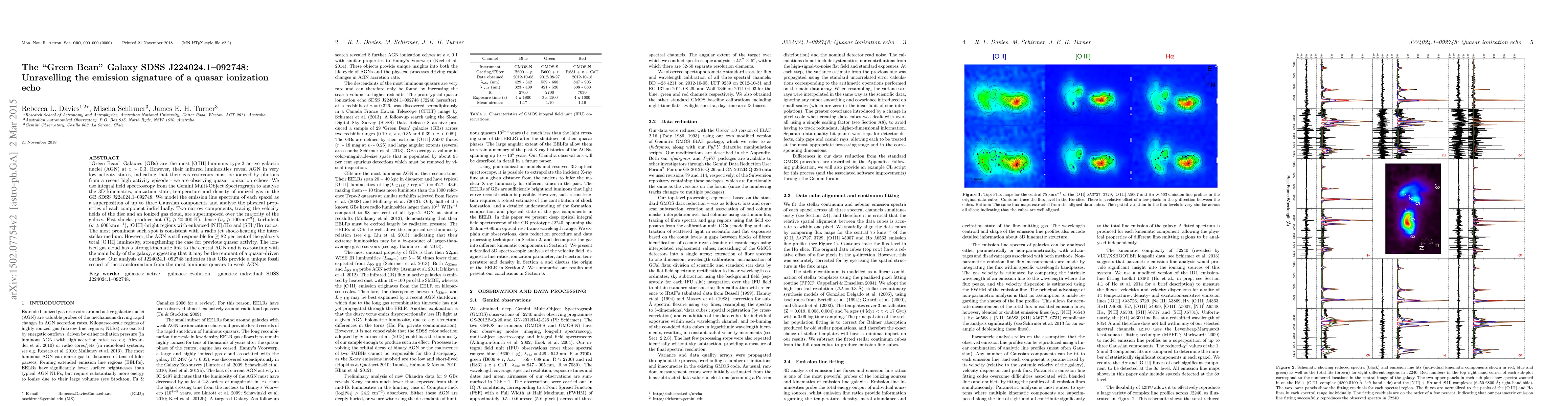 "Green Bean" Galaxies (GBs) are the most [O III]-luminous type-2 active galactic nuclei (AGN) at z~0.3. However, their infrared luminosities reveal AGN in very low activity states, indicating that their gas reservoirs must be ionized by photons from a recent high activity episode - we are observing quasar ionization echoes. We use integral field spectroscopy from the Gemini Multi-Object Spectrograph to analyse the 3D kinematics, ionization state, temperature and density of ionized gas in the GB SDSS J224024.1-092748. We model the emission line spectrum of each spaxel as a superposition of up to three Gaussian components and analyse the physical properties of each component individually. Two narrow components, tracing the velocity fields of the disc and an ionized gas cloud, are superimposed over the majority of the galaxy. Fast shocks produce hot ($T_e$ $\geq$ 20,000 K), dense ($n_e$ $\geq$ 100 cm$^{-3}$), turbulent ($\sigma$ $\geq$ 600 km s$^{-1}$), [O III]-bright regions with enhanced [N II]/H$\alpha$ and [S II]/H$\alpha$ ratios. The most prominent such spot is consistent with a radio jet shock-heating the interstellar medium. However, the AGN is still responsible for $\geq$ 82 per cent of the galaxy's total [O III] luminosity, strengthening the case for previous quasar activity. The ionized gas cloud has a strong kinematic link to the central AGN and is co-rotating with the main body of the galaxy, suggesting that it may be the remnant of a quasar-driven outflow. Our analysis of J224024.1-092748 indicates that GBs provide a unique fossil record of the transformation from the most luminous quasars to weak AGN.