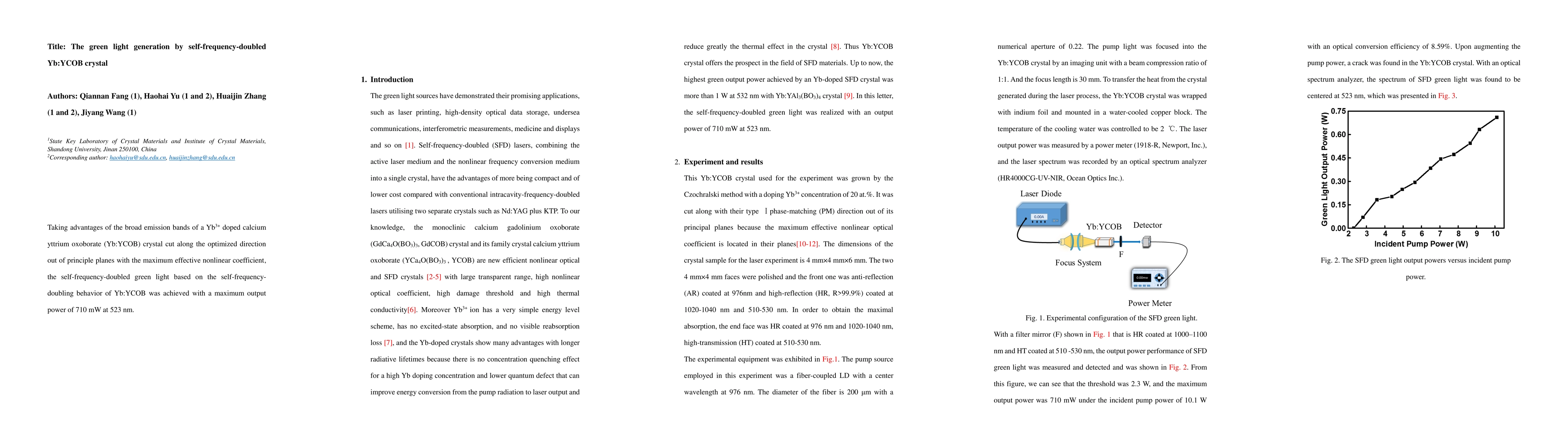 Taking advantages of the broad emission bands of a Yb3+ doped calcium yttrium oxoborate (Yb:YCOB) crystal cut along the optimized direction out of principle planes with the maximum effective nonlinear coefficient, the self-frequency-doubled green light based on the self-frequency-doubling behavior of Yb:YCOB was achieved with a maximum output power of 710 mW at 523 nm.