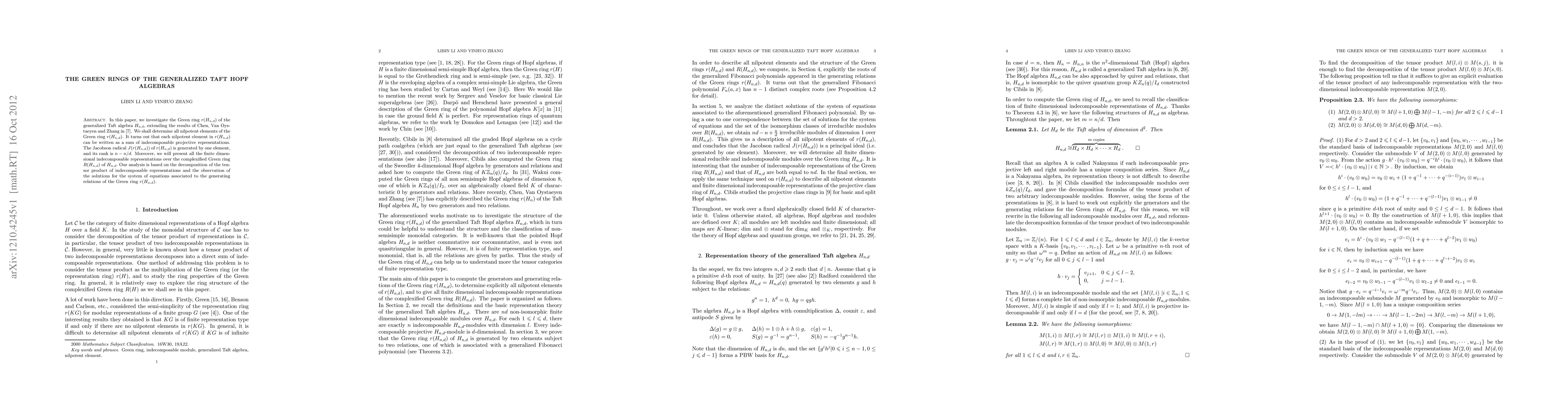 The paper provides a detailed analysis of the Green ring structure for generalized Taft Hopf algebras, including the determination of nilpotent elements and indecomposable representations.
