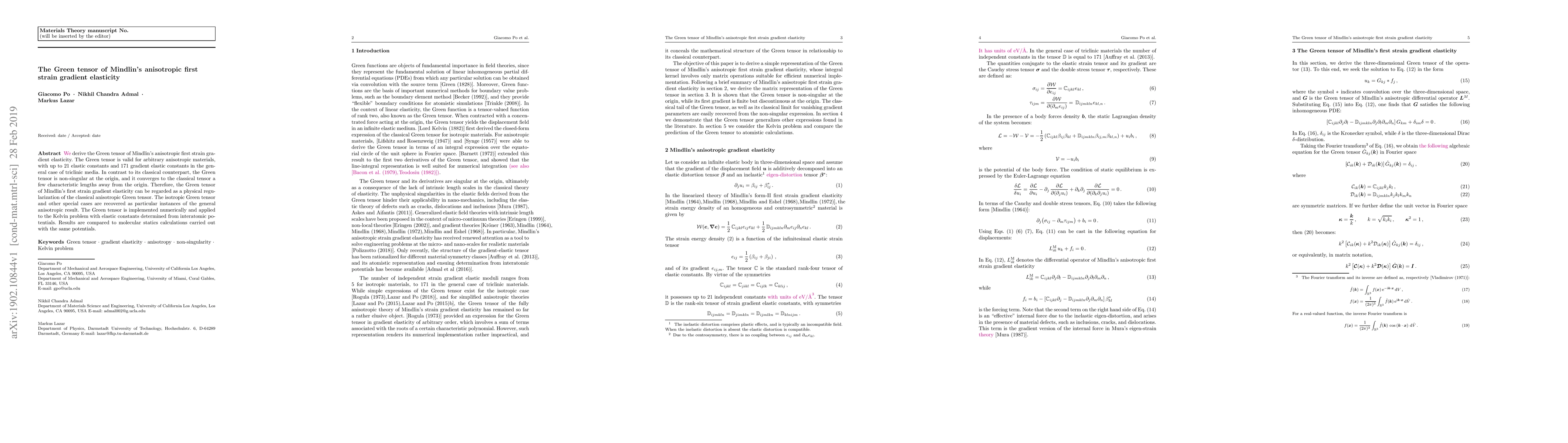 This paper derives the Green tensor for Mindlin's anisotropic first strain gradient elasticity, showing it is non-singular and converges to the classical tensor at larger distances. Numerical implementations and comparisons to molecular statics validate the tensor's effectiveness for anisotropic materials.