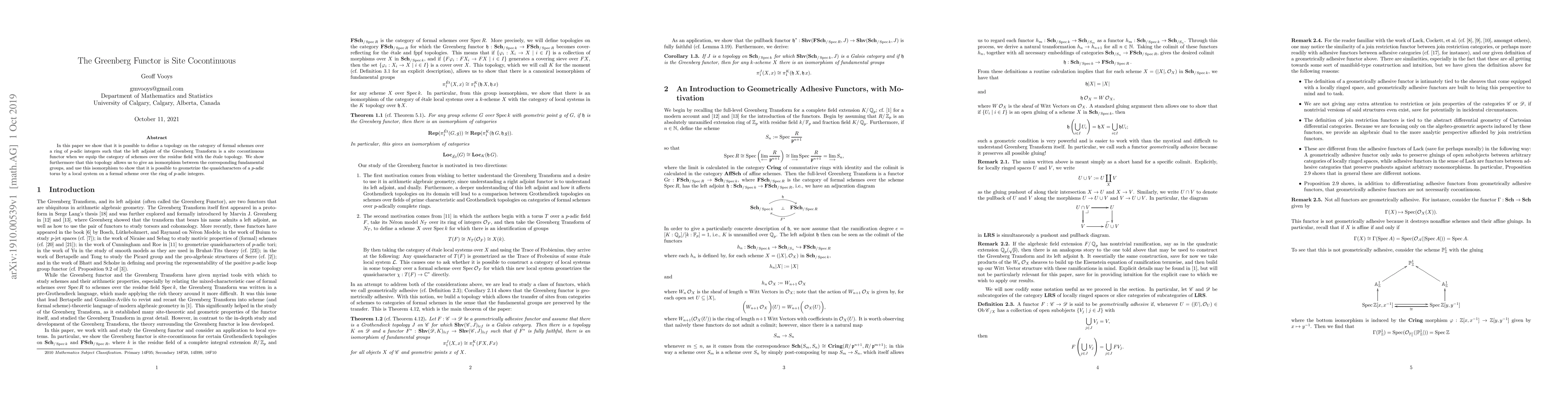 In this paper we show that it is possible to define a topology on the category of formal schemes over a ring of $p$-adic integers such that the left adjoint of the Greenberg Transform is a site cocontinuous functor when we equip the category of schemes over the residue field with the \'etale topology. We show furthermore that this topology allows us to give an isomorphism between the corresponding fundamental groups, and use this isomorphism to show that it is possible to geometrize the quasicharacters of a $p$-adic torus by a local system on a formal scheme over the ring of $p$-adic integers.