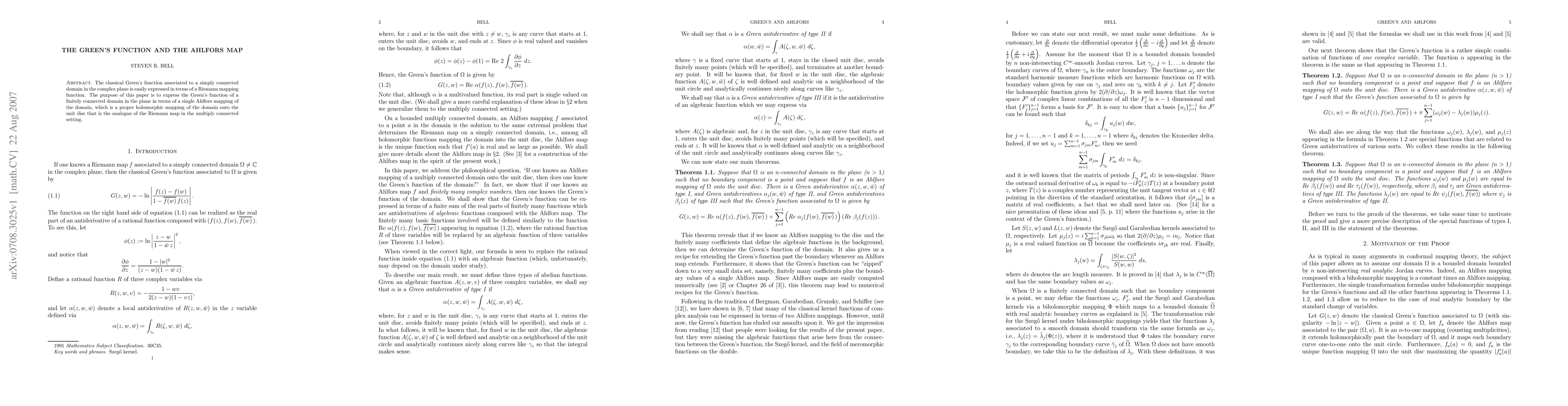 This paper explores the Green's function for finitely connected domains in the complex plane, expressing it in terms of a single Ahlfors map, a proper holomorphic mapping analogous to the Riemann map for multiply connected domains. The study extends classical results to more complex geometries.