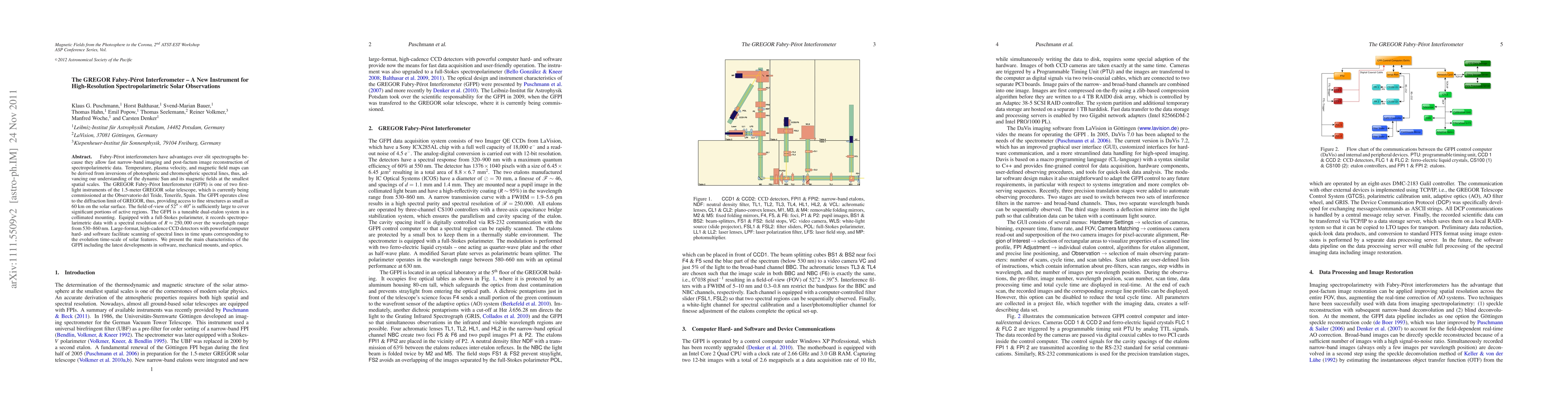 The GREGOR Fabry-Perot Interferometer (GFPI) is a high-resolution spectropolarimetric instrument for solar observations, enabling fast, narrow-band imaging and detailed reconstruction of solar magnetic fields and plasma dynamics. It operates with a spectral resolution of R = 250,000 and covers wavelengths from 530-860 nm, providing insights into fine solar structures as small as 60 km.