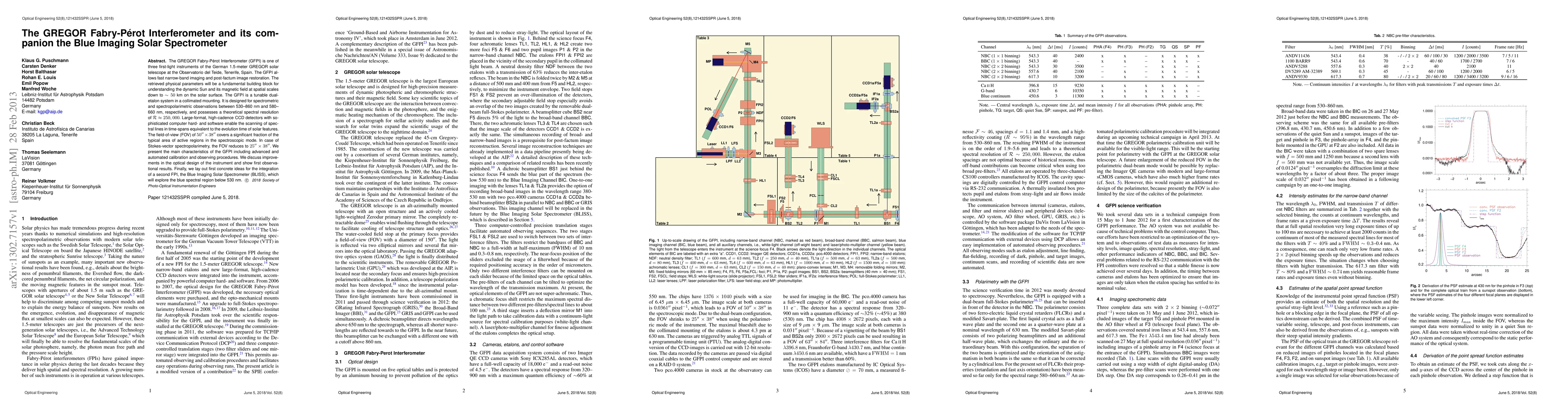 The GREGOR Fabry-Pérot Interferometer (GFPI) is a high-resolution instrument for the GREGOR solar telescope, enabling detailed spectroscopic and spectropolarimetric observations of the Sun. It is complemented by the Blue Imaging Solar Spectrometer (BLISS) to extend observations into the blue spectral region.