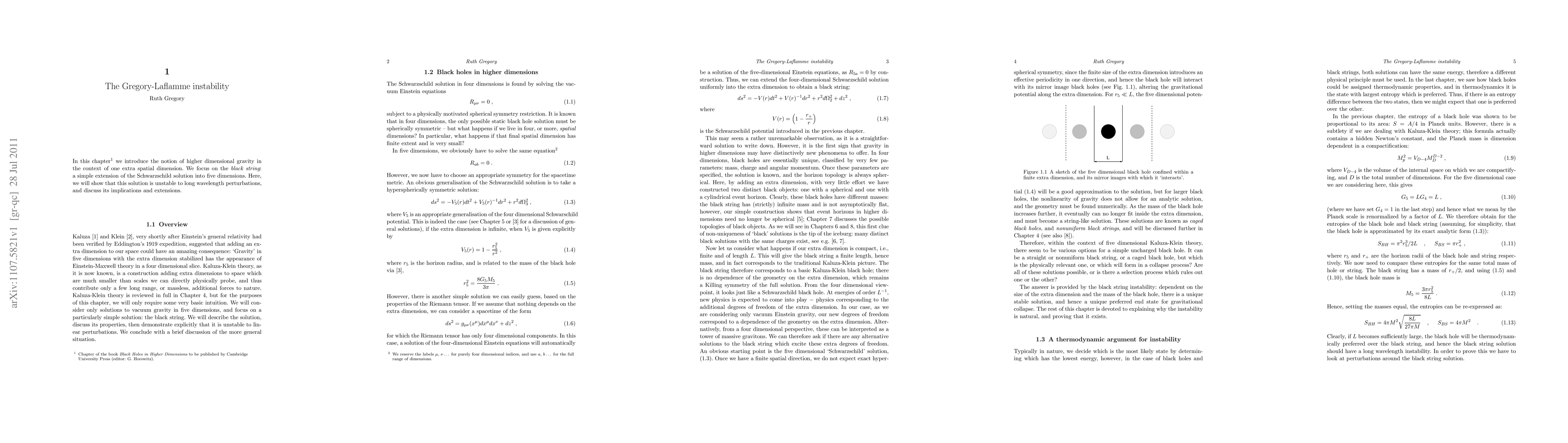 I give a brief review of the Gregory-Laflamme instability as originally found for a 5-dimensional black string. This is a chapter of the book "Black Holes in Higher Dimensions" to be published by Cambridge University Press (editor: G. Horowitz)