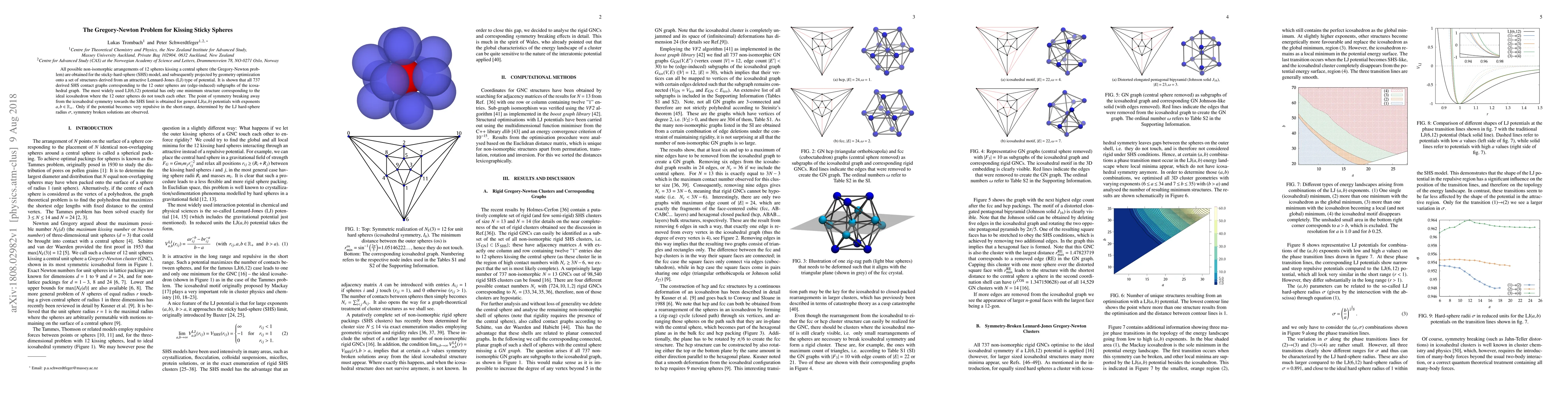 All possible non-isomorphic arrangements of 12 spheres kissing a central sphere (the Gregory-Newton problem) are obtained for the sticky-hard-sphere (SHS) model, and subsequently projected by geometry optimization onto a set of structures derived from an attractive Lennard-Jones (LJ) type of potential. It is shown that all 737 derived SHS contact graphs corresponding to the 12 outer spheres are (edge-induced) subgraphs of the icosahedral graph. The most widely used LJ(6,12) potential has only one minimum structure corresponding to the ideal icosahedron where the 12 outer spheres do not touch each other. The point of symmetry breaking away from the icosahedral symmetry towards the SHS limit is obtained for general LJ($a,b$) potentials with exponents $a,b\in \mathbb{R}_+$. Only if the potential becomes very repulsive in the short-range, determined by the LJ hard-sphere radius $\sigma$, symmetry broken solutions are observed.
