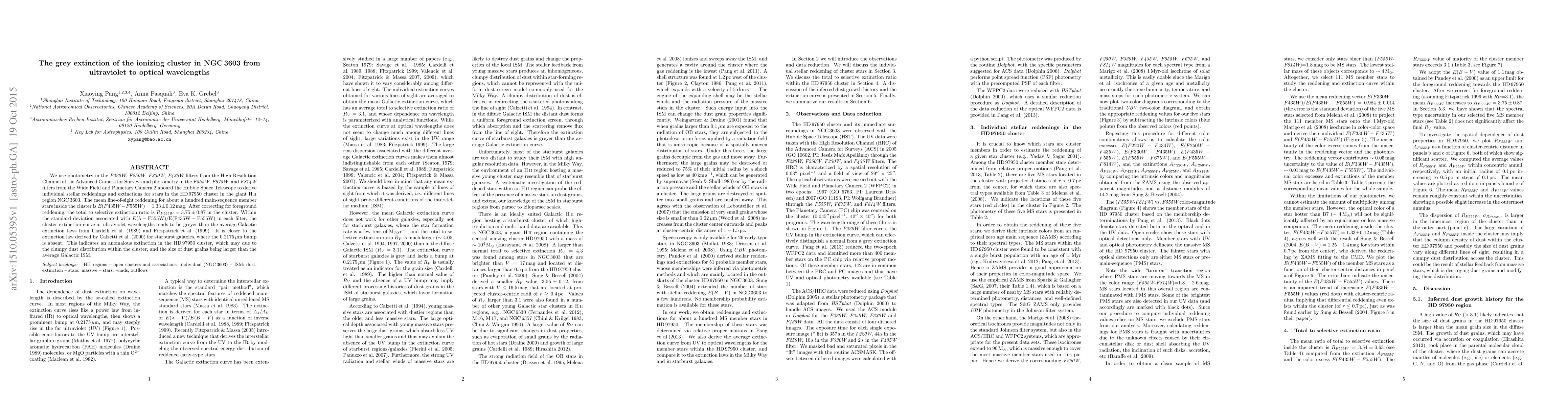The study of NGC 3603's ionizing cluster found an anomalous extinction curve that is grayer than average Galactic laws, suggesting clumpy dust distribution and larger dust grains.