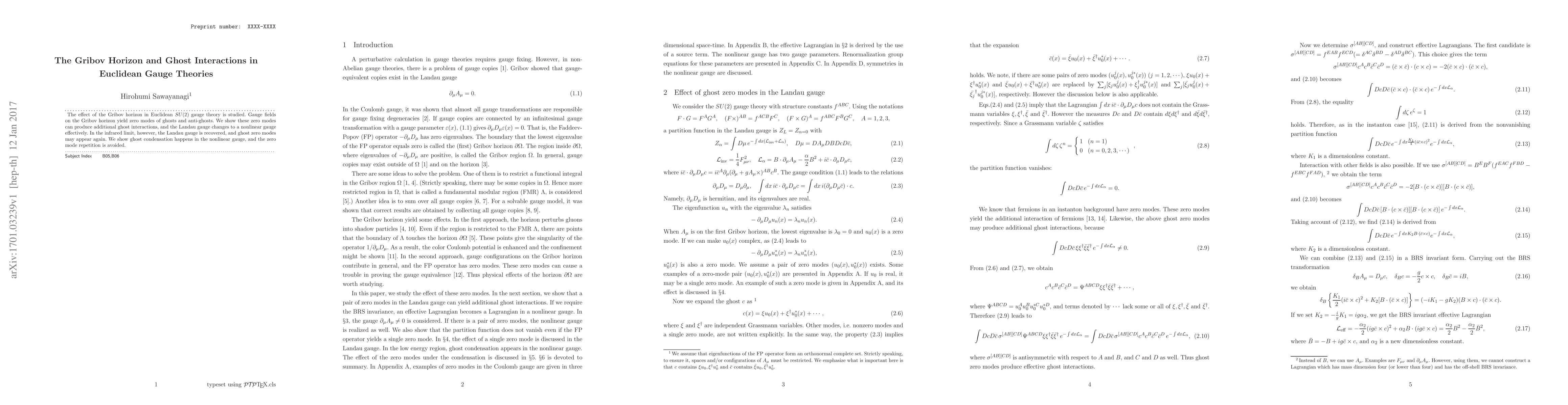 The study reveals that the Gribov horizon in Euclidean $SU(2)$ gauge theory generates ghost zero modes, leading to new ghost interactions and a shift from the Landau gauge to a nonlinear gauge. Ghost condensation in the nonlinear gauge prevents repetition of zero modes.