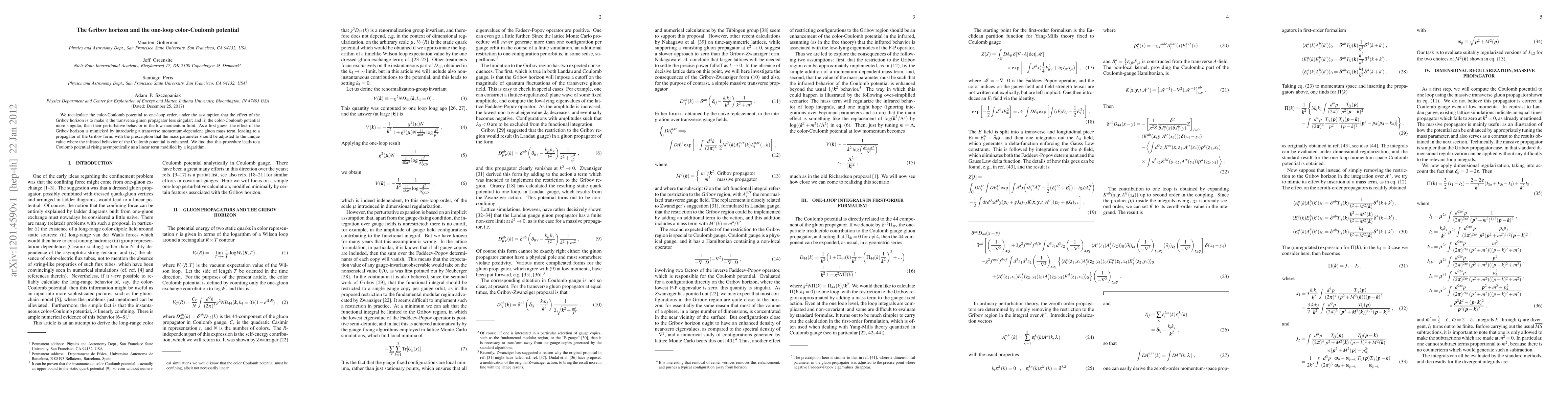 The paper recalculates the color-Coulomb potential to one-loop order, considering the Gribov horizon's influence on the transverse gluon propagator and the potential's singularity. The result is a Coulomb potential that rises linearly in the infrared limit, modified by a logarithmic term.