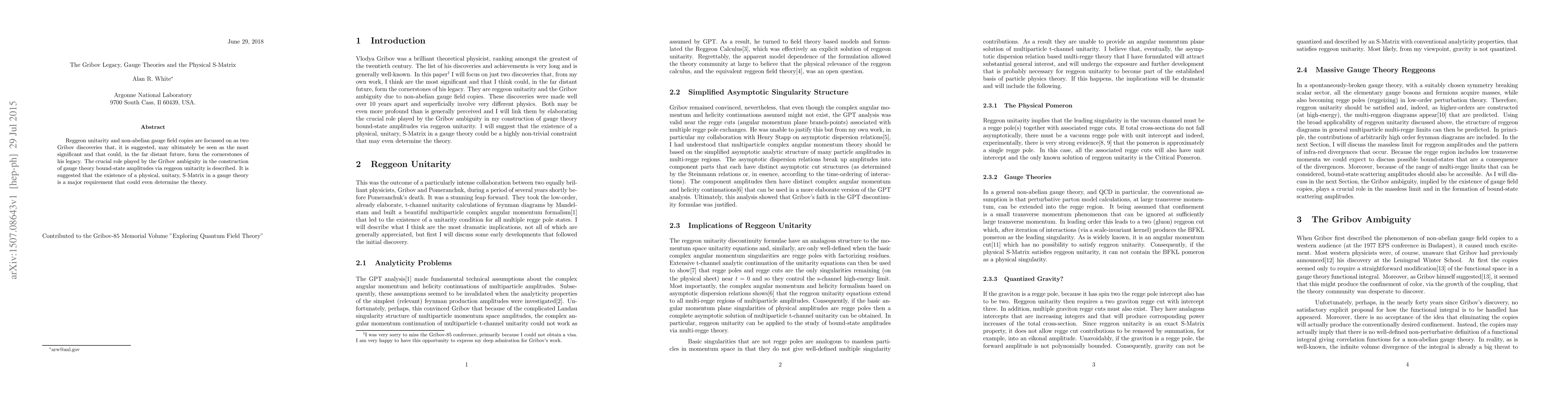 Reggeon unitarity and non-abelian gauge field copies are focussed on as two Gribov discoveries that, it is suggested, may ultimately be seen as the most significant and that could, in the far distant future, form the cornerstones of his legacy. The crucial role played by the Gribov ambiguity in the construction of gauge theory bound-state amplitudes via reggeon unitarity is described. It is suggested that the existence of a physical, unitary, S-Matrix in a gauge theory is a major requirement that could even determine the theory.