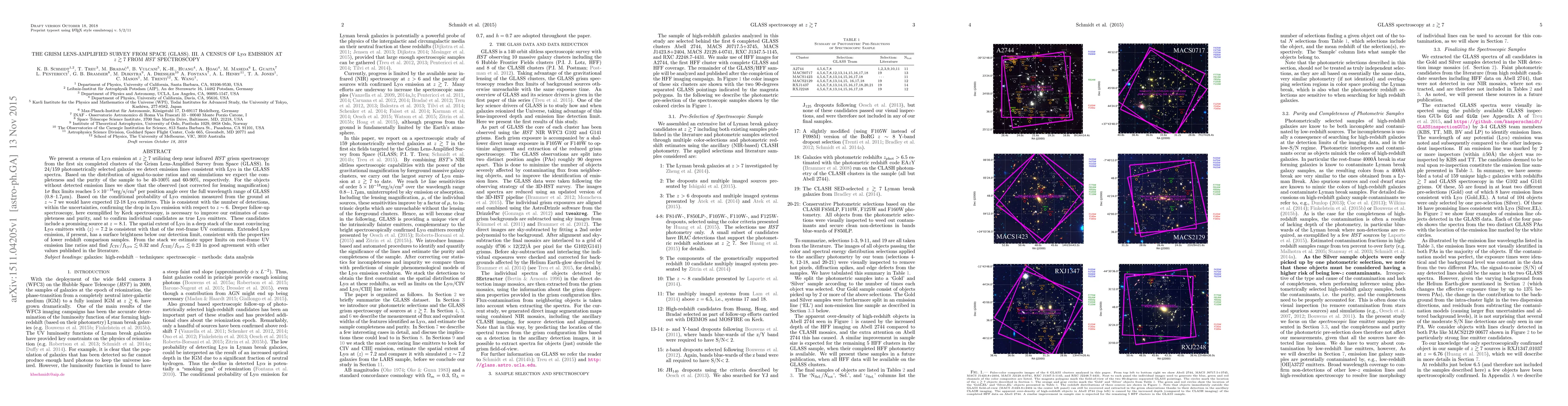 [abbreviated] We present a census of Ly\alpha\ emission at $z\gtrsim7$ utilizing deep near infrared HST grism spectroscopy from the first six completed clusters of the Grism Lens-Amplified Survey from Space (GLASS). In 24/159 photometrically selected galaxies we detect emission lines consistent with Ly\alpha\ in the GLASS spectra. Based on the distribution of signal-to-noise ratios and on simulations we expect the completeness and the purity of the sample to be 40-100% and 60-90%, respectively. For the objects without detected emission lines we show that the observed (not corrected for lensing magnification) 1$\sigma$ flux limits reaches $5\times10^{-18}$erg/s/cm$^{2}$ per position angle over the full wavelength range of GLASS (0.8-1.7$\mu$m). Based on the conditional probability of Ly\alpha\ emission measured from the ground at $z\sim7$ we would have expected 12-18 Ly\alpha\ emitters. This is consistent with the number of detections, within the uncertainties, confirming the drop in Ly\alpha\ emission with respect to $z\sim6$. These candidates include a promising source at $z=8.1$. The spatial extent of Ly\alpha\ in a deep stack of the most convincing Ly\alpha\ emitters with $\langle z\rangle=7.2$ is consistent with that of the rest-frame UV continuum. Extended Ly$\alpha$ emission, if present, has a surface brightness below our detection limit, consistent with the properties of lower redshift comparison samples. From the stack we estimate upper limits on rest-frame UV emission line ratios and find $f_\textrm{CIV} / f_\textrm{Ly${\alpha}$} \lesssim 0.32$ and $f_\textrm{CIII]} / f_\textrm{Ly$\alpha$} \lesssim 0.23$ in good agreement with other values published in the literature.