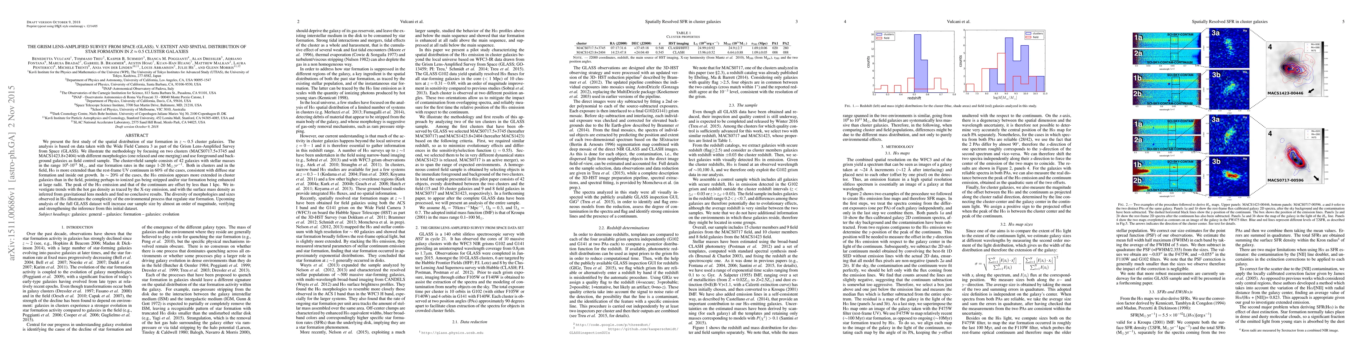 We present the first study of the spatial distribution of star formation in z~0.5 cluster galaxies. The analysis is based on data taken with the Wide Field Camera 3 as part of the Grism Lens-Amplified Survey from Space (GLASS). We illustrate the methodology by focusing on two clusters (MACS0717.5+3745 and MACS1423.8+2404) with different morphologies (one relaxed and one merging) and use foreground and background galaxies as field control sample. The cluster+field sample consists of 42 galaxies with stellar masses in the range 10^8-10^11 M_sun, and star formation rates in the range 1-20 M_sun/yr. Both in clusters and in the field, H{\alpha} is more extended than the rest-frame UV continuum in 60% of the cases, consistent with diffuse star formation and inside out growth. In ~20% of the cases, the H{\alpha} emission appears more extended in cluster galaxies than in the field, pointing perhaps to ionized gas being stripped and/or star formation being enhanced at large radii. The peak of the H{\alpha} emission and that of the continuum are offset by less than 1 kpc. We investigate trends with the hot gas density as traced by the X-ray emission, and with the surface mass density as inferred from gravitational lens models and find no conclusive results. The diversity of morphologies and sizes observed in H_alpha illustrates the complexity of the environmental process that regulate star formation. Upcoming analysis of the full GLASS dataset will increase our sample size by almost an order of magnitude, verifying and strengthening the inference from this initial dataset.