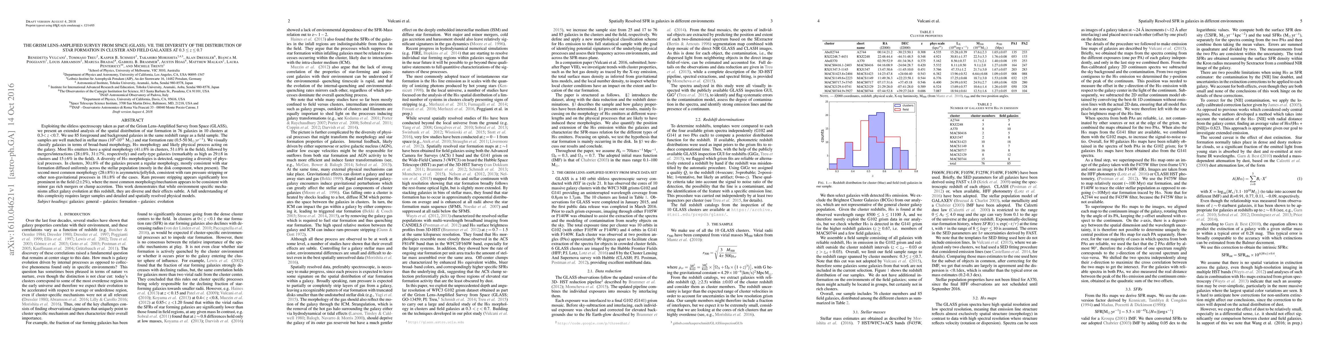 The study, using data from GLASS, examines 76 cluster and 85 field galaxies at 0.3<z<0.7. It finds diverse spatial star formation patterns, with spiral galaxies being the most common (41% in clusters, 51% in the field), followed by mergers/interactions and early-types. In clusters, 28% show asymmetric/jellyfish morphologies indicative of ram pressure stripping, while in the field, minor gas-rich mergers or clump accretion are more common. The findings suggest environmental impacts on galaxy evolution are varied and subtle.
