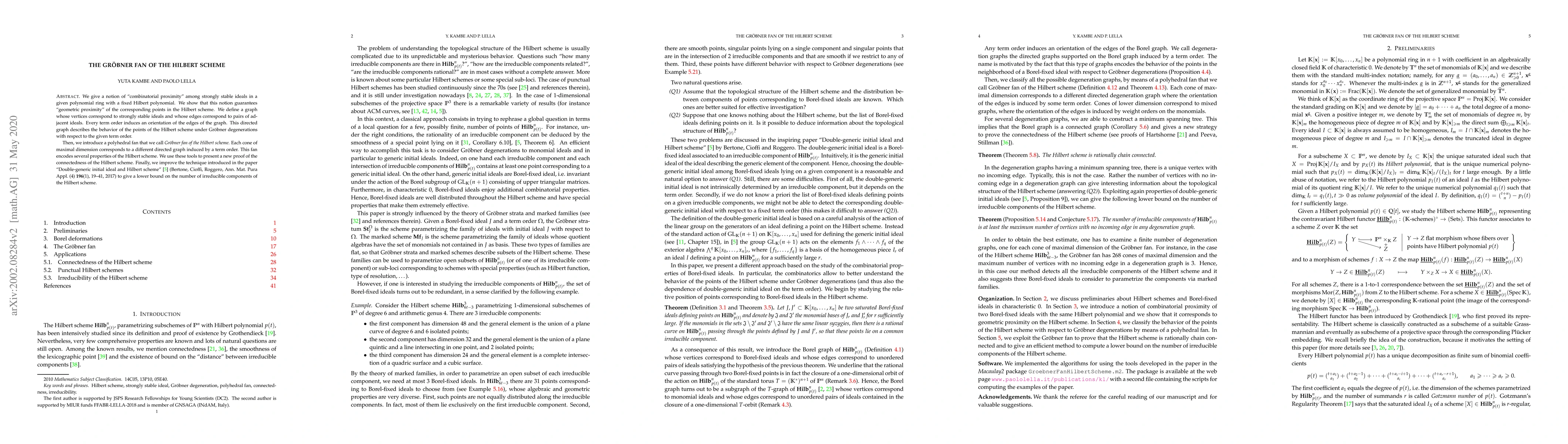 We give a notion of "combinatorial proximity" among strongly stable ideals in a given polynomial ring with a fixed Hilbert polynomial. We show that this notion guarantees "geometric proximity" of the corresponding points in the Hilbert scheme. We define a graph whose vertices correspond to strongly stable ideals and whose edges correspond to pairs of adjacent ideals. Every term order induces an orientation of the edges of the graph. This directed graph describes the behavior of the points of the Hilbert scheme under Gr\"obner degenerations with respect to the given term order. Then, we introduce a polyhedral fan that we call Gr\"obner fan of the Hilbert scheme. Each cone of maximal dimension corresponds to a different directed graph induced by a term order. This fan encodes several properties of the Hilbert scheme. We use these tools to present a new proof of the connectedness of the Hilbert scheme. Finally, we improve the technique introduced in the paper "Double-generic initial ideal and Hilbert scheme" by Bertone, Cioffi and Roggero to give a lower bound on the number of irreducible components of the Hilbert scheme.