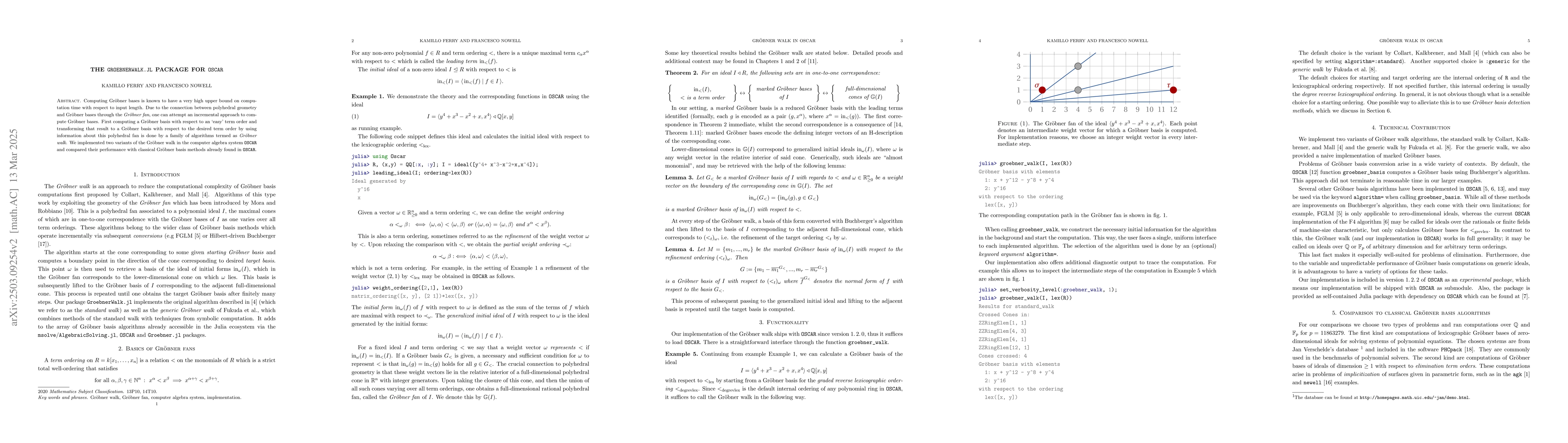 The implementation of two Gröbner walk variants (standard by Collart, Kalkbrener, and Mall; generic by Fukuda et al.) in OSCAR, providing full generality for Gröbner basis computations over Q or Fp for arbitrary dimensions and term orderings.