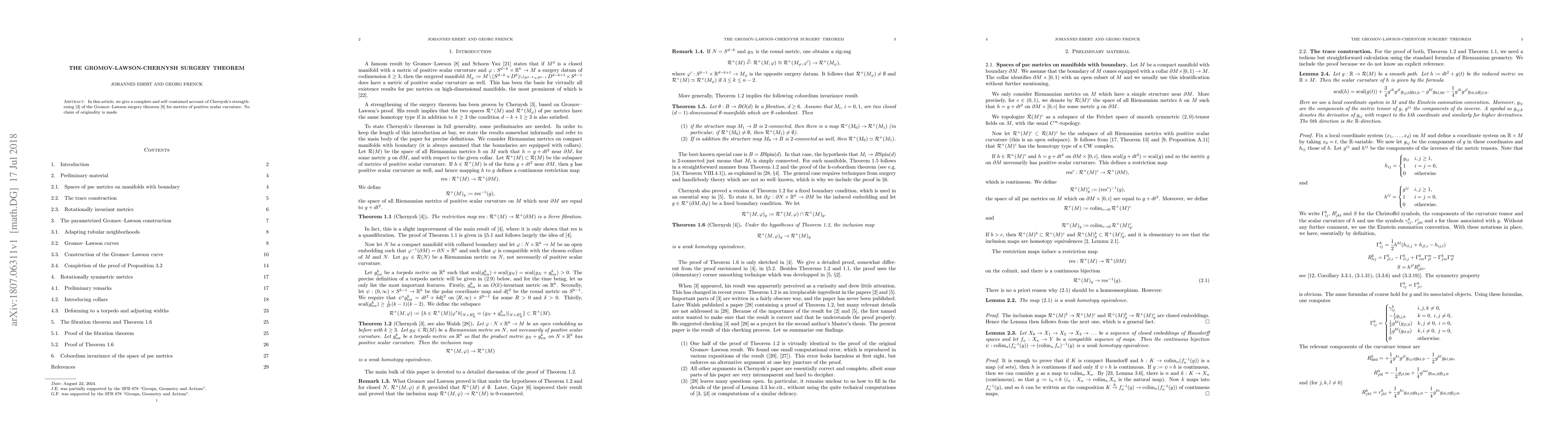 Summary: This paper provides a comprehensive presentation of Chernysh's enhancement of the Gromov-Lawson surgery theorem, focusing on metrics with positive scalar curvature, without asserting any new original findings.