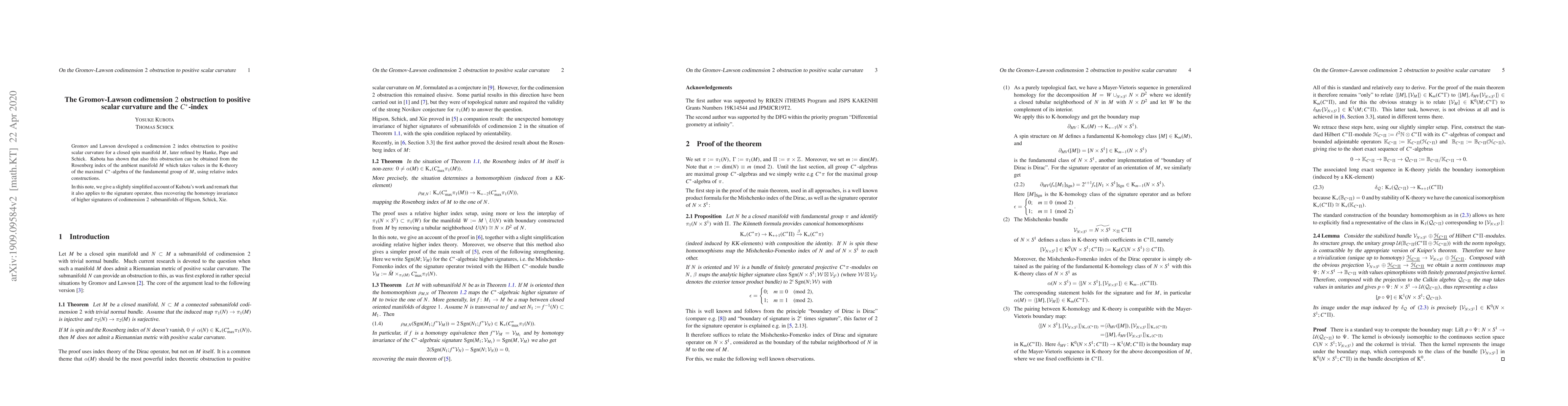 This paper presents a simplified explanation of Kubota's work linking the Gromov-Lawson codimension 2 obstruction to positive scalar curvature with the C*-index, demonstrating its application to the signature operator and confirming the homotopy invariance of higher signatures.