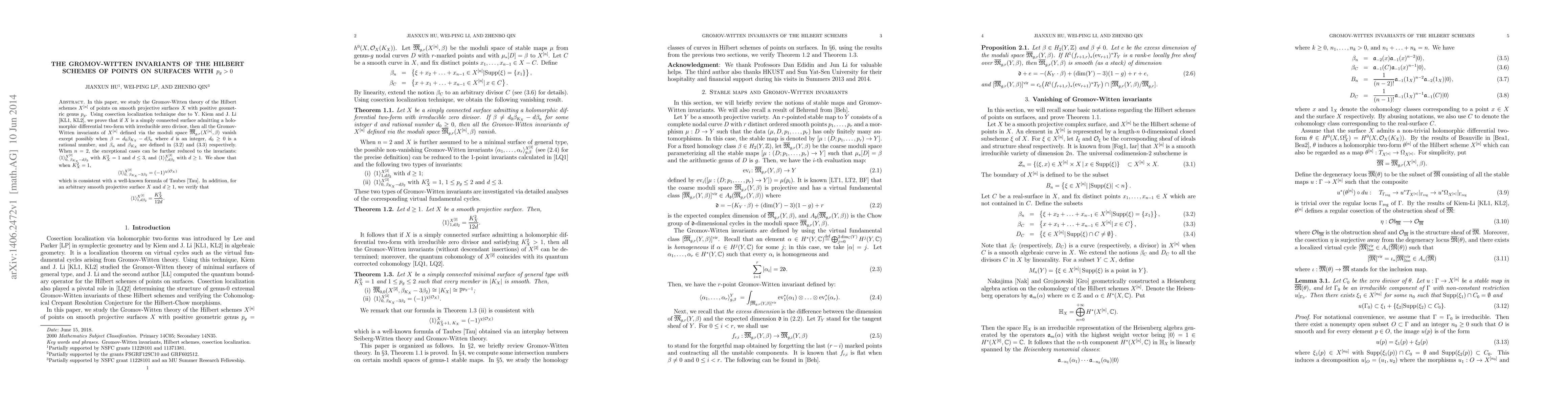 Researchers study Gromov-Witten invariants of Hilbert schemes on surfaces with positive genus, finding exceptions for specific values that relate to the surface's geometry.