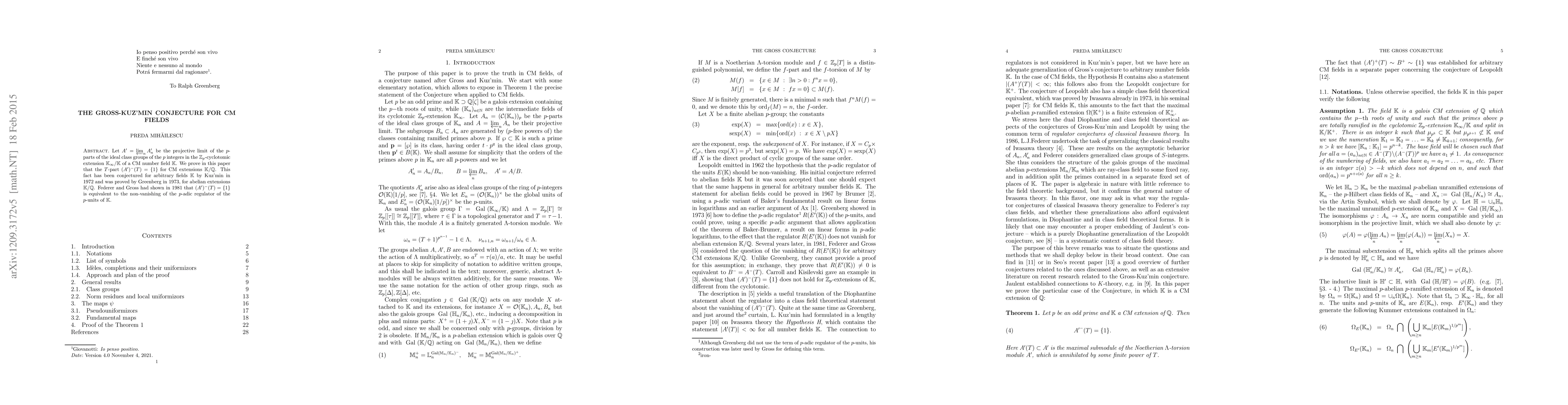 Let $A' = \varprojlim_n A'_n$ be the projective limit of the $p$-parts of the ideal class groups of the $p$ integers in the $\mathbb{Z}_p$-cyclotomic extension $K_{\infty}/K$ of a CM number field $K$. We prove in this paper that the $T$-part $(A')^-(T) = \{ 1 \}$ for CM extensions $K/\mathbb{Q}$. This fact has been conjectured for arbitrary fields $K$ by Kuz'min in 1972 and was proved by Greenberg in 1973, for abelian extensions $K/\mathbb{Q}$. Federer and Gross had shown in 1981 that $(A')^-(T) = \{ 1 \}$ is equivalent to the non-vanishing of the $p$-adic regulator of the $p$-units of $K$.