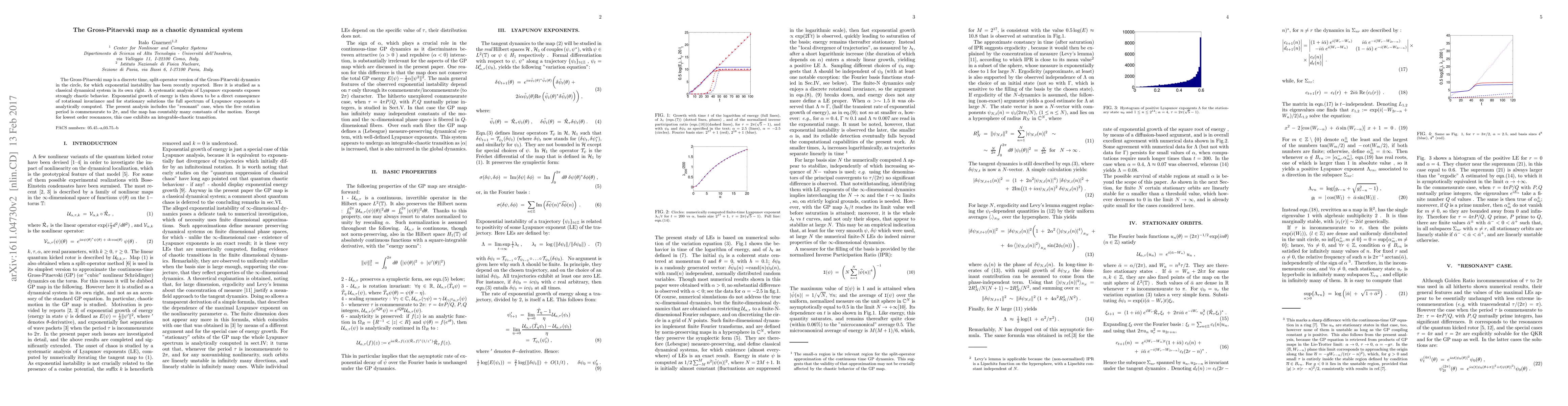 The Gross Pitaevski map demonstrates strongly chaotic behavior with exponential instability, as analyzed through Lyapunov exponents. The study reveals that rotational invariance leads to exponential energy growth, with a full spectrum of Lyapunov exponents computed for stationary solutions, including an integrable-chaotic transition in resonant cases.