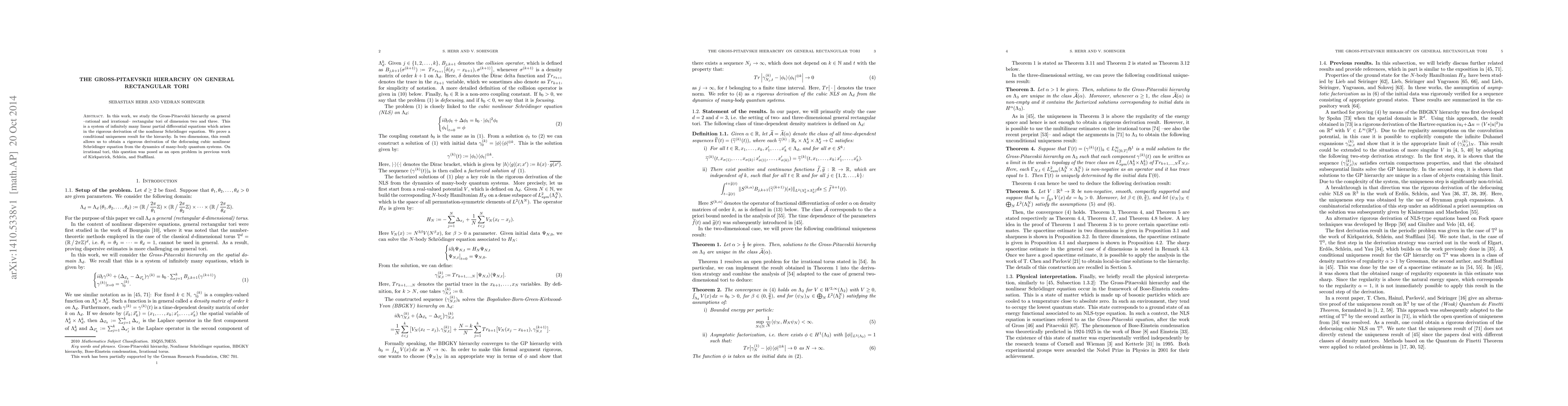 In this work, we study the Gross-Pitaevskii hierarchy on general --rational and irrational-- rectangular tori of dimension two and three. This is a system of infinitely many linear partial differential equations which arises in the rigorous derivation of the nonlinear Schr\"{o}dinger equation. We prove a conditional uniqueness result for the hierarchy. In two dimensions, this result allows us to obtain a rigorous derivation of the defocusing cubic nonlinear Schr\"{o}dinger equation from the dynamics of many-body quantum systems. On irrational tori, this question was posed as an open problem in previous work of Kirkpatrick, Schlein, and Staffilani.