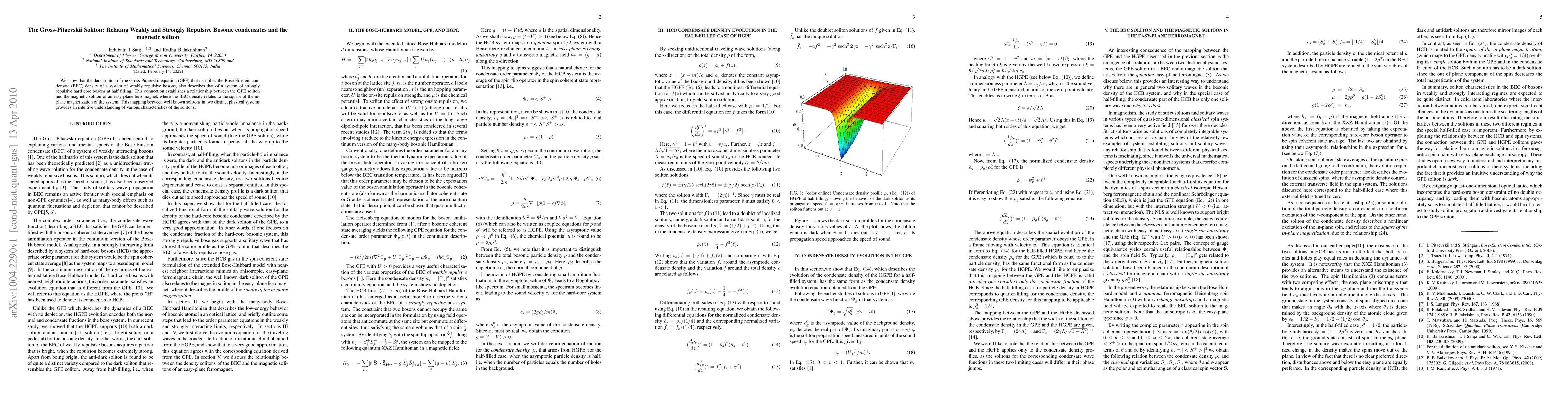 The paper establishes a relationship between the dark soliton in weakly repulsive bosonic condensates and strongly repulsive hard core bosons, showing they share the same Gross-Pitaevskii equation description. This connection also links the GPE soliton to the magnetic soliton in an easy-plane ferromagnet, providing insights into their shared characteristics.