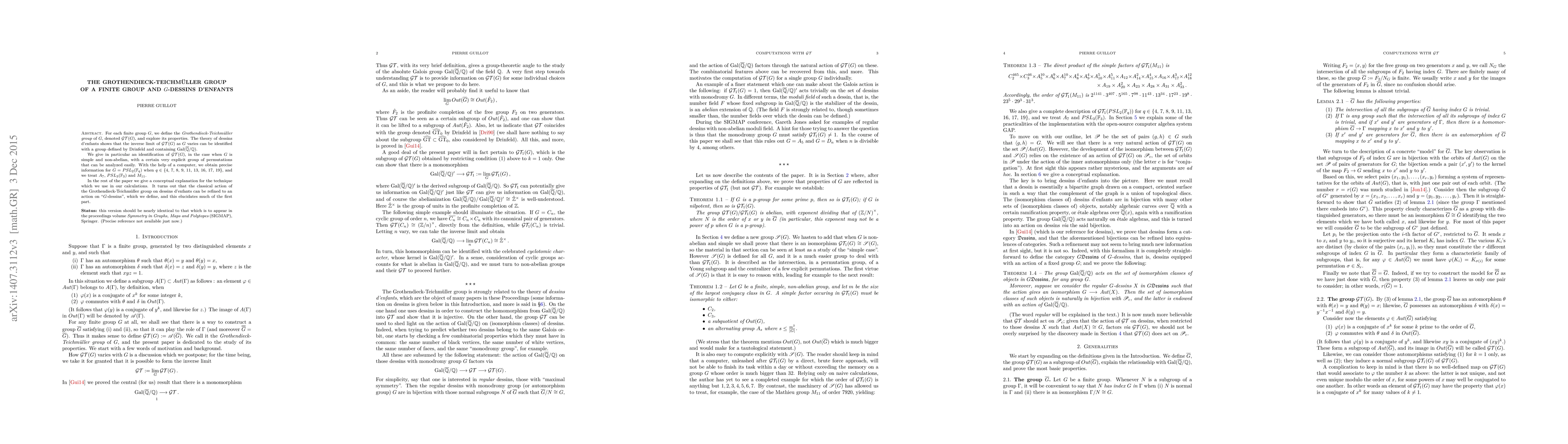 The paper defines the Grothendieck-Teichmüller group of a finite group, GT(G), and explores its properties. It identifies GT(G) with a specific group of permutations for simple, non-abelian groups, providing explicit calculations for certain cases using computer assistance.