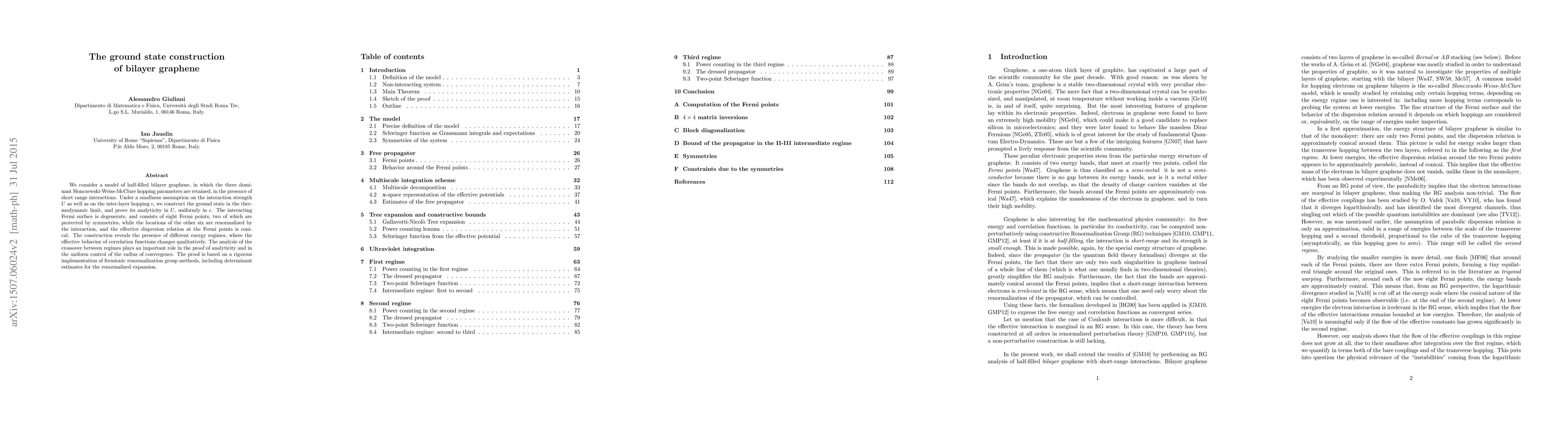 This paper constructs the ground state of bilayer graphene with short-range interactions, revealing a degenerate Fermi surface with conical dispersion relations and different energy regimes that affect correlation functions.