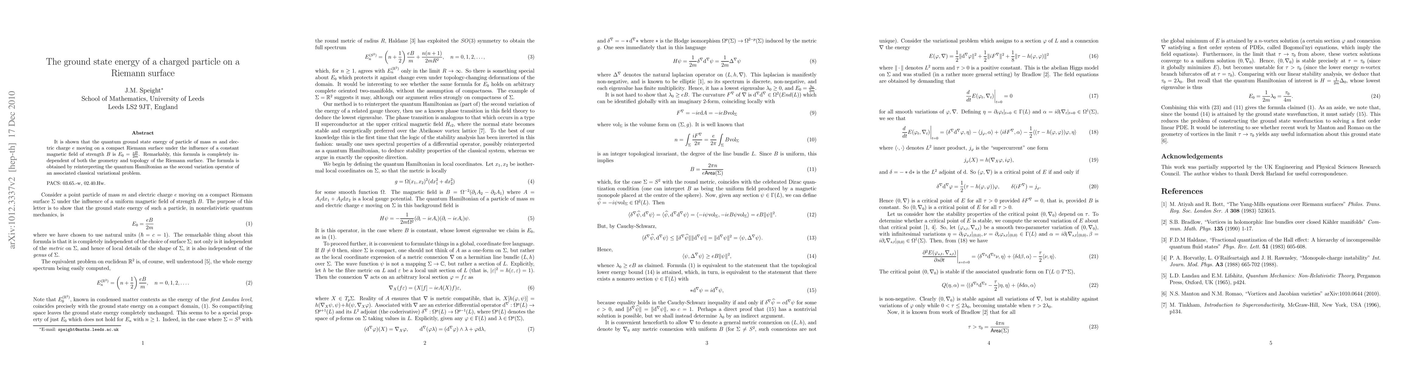 It is shown that the quantum ground state energy of particle of mass m and electric charge e moving on a compact Riemann surface under the influence of a constant magnetic field of strength B is E_0=eB/2m. Remarkably, this formula is completely independent of both the geometry and topology of the Riemann surface. The formula is obtained by reinterpreting the quantum Hamiltonian as the second variation operator of an associated classical variational problem.