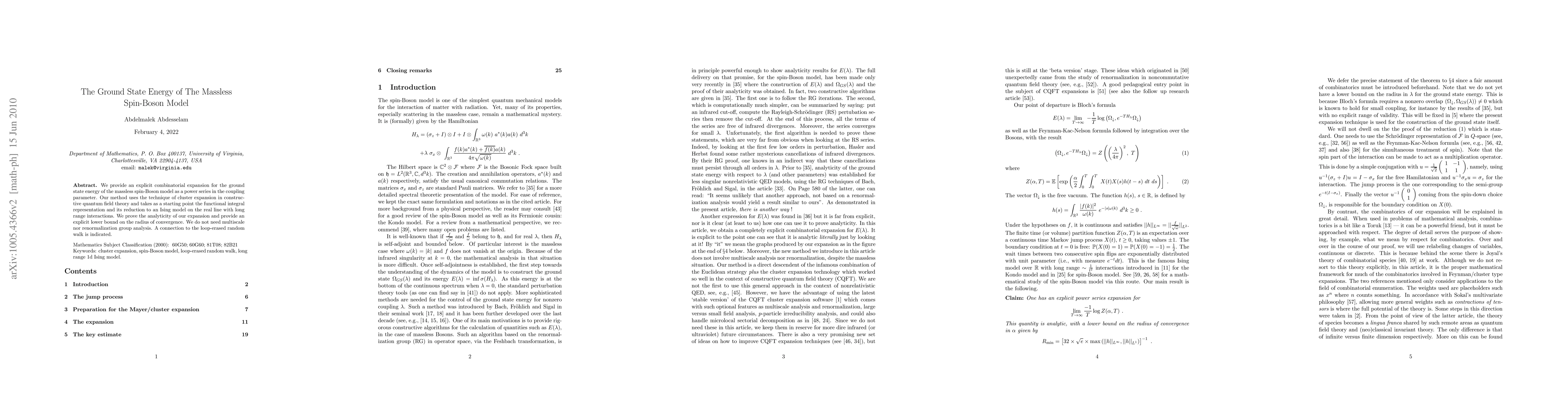 We provide an explicit combinatorial expansion for the ground state energy of the massless spin-Boson model as a power series in the coupling parameter. Our method uses the technique of cluster expansion in constructive quantum field theory and takes as a starting point the functional integral representation and its reduction to an Ising model on the real line with long range interactions. We prove the analyticity of our expansion and provide an explicit lower bound on the radius of convergence. We do not need multiscale nor renormalization group analysis. A connection to the loop-erased random walk is indicated.