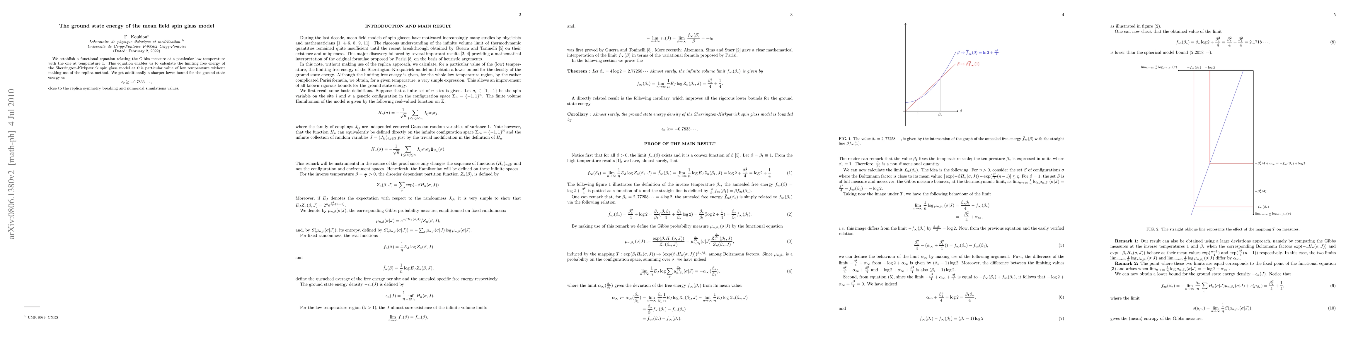 From the study of a functional equation of Gibbs measures we calculate the limiting free energy of the Sherrington-Kirkpatrick spin glass model at a particular value of (low) temperature. This implies the following lower bound for the ground state energy $\epsilon_0$ \[\epsilon_0\geq -0.7833\cdots,\] close to the replica symmetry breaking and numerical simulations values.