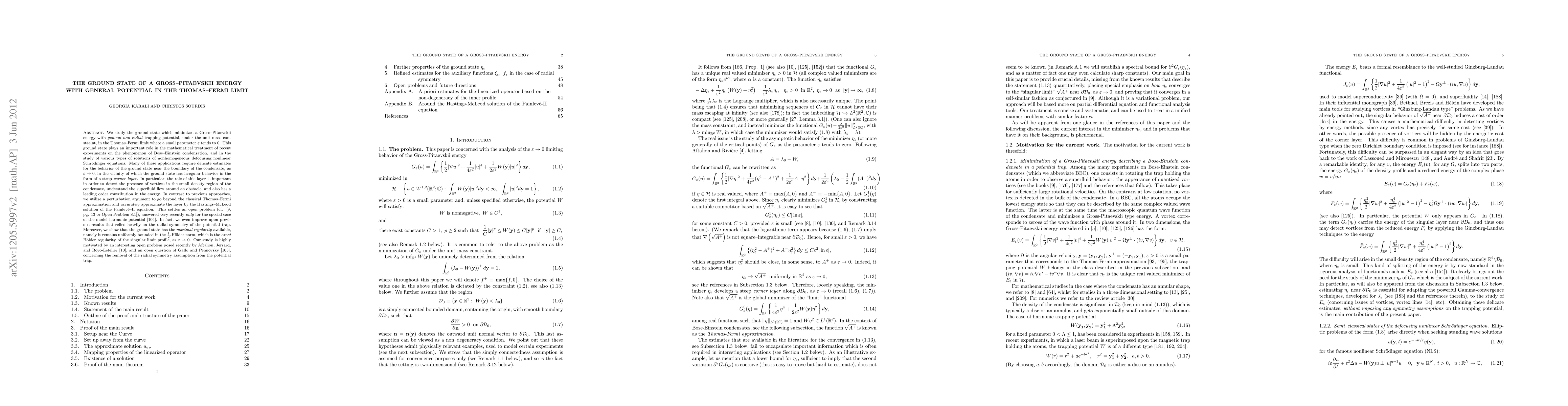 We study the ground state which minimizes a Gross-Pitaevskii energy with general non-radial trapping potential, under the unit mass constraint, in the Thomas-Fermi limit where a small parameter tends to 0. This ground state plays an important role in the mathematical treatment of recent experiments on the phenomenon of Bose-Einstein condensation, and in the study of various types of solutions of nonhomogeneous defocusing nonlinear Schrodinger equations. Many of these applications require delicate estimates for the behavior of the ground state near the boundary of the condensate, as the singular parameter tends to zero, in the vicinity of which the ground state has irregular behavior in the form of a steep corner layer. In particular, the role of this layer is important in order to detect the presence of vortices in the small density region of the condensate, understand the superfluid flow around an obstacle, and also has a leading order contribution in the energy. In contrast to previous approaches, we utilize a perturbation argument to go beyond the classical Thomas-Fermi approximation and accurately approximate the layer by the Hastings-McLeod solution of the Painleve-II equation. This settles an open problem, answered very recently only for the special case of the model harmonic potential. In fact, we even improve upon previous results that relied heavily on the radial symmetry of the potential trap. Moreover, we show that the ground state has the maximal regularity available, namely it remains uniformly bounded in the 1/2-Holder norm, which is the exact Holder regularity of the singular limit profile, as the singular parameter tends to zero. Our study is highly motivated by an interesting open problem posed recently by Aftalion, Jerrard, and Royo-Letelier, and an open question of Gallo and Pelinovsky, concerning the removal of the radial symmetry assumption from the potential trap.