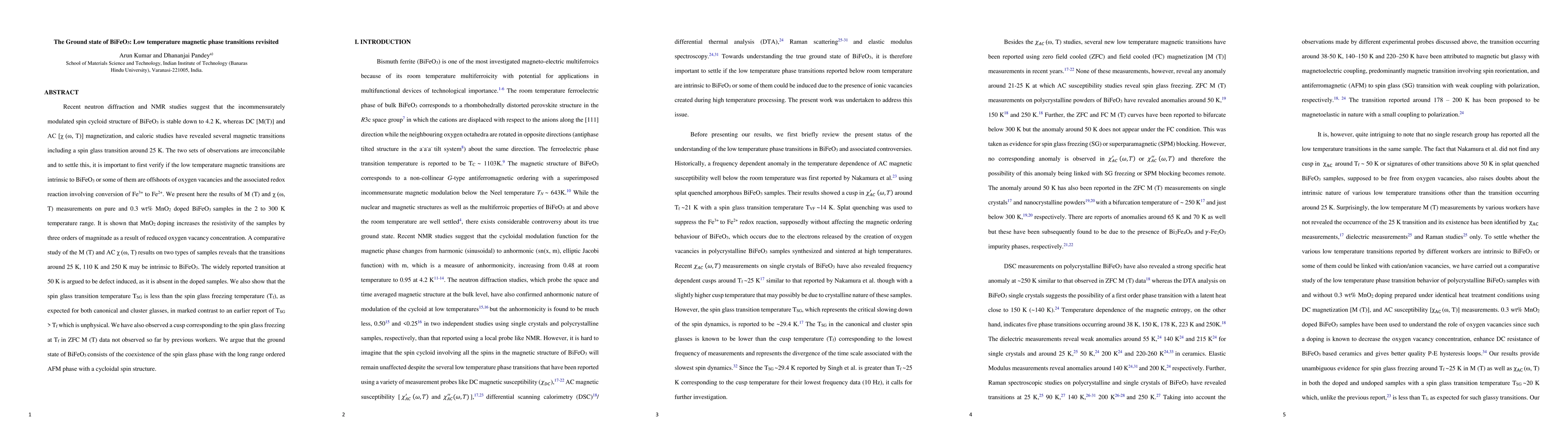 Recent neutron diffraction and NMR studies suggest that the incommensurately modulated spin cycloid structure of BiFeO3 is stable down to 4.2 K, whereas DC [M(T)] and AC [\c{hi} ({\omega}, T)] magnetization, and caloric studies have revealed several magnetic transitions including a spin glass transition around 25 K. The two sets of observations are irreconcilable and to settle this, it is important to first verify if the low temperature magnetic transitions are intrinsic to BiFeO3 or some of them are offshoots of oxygen vacancies and the associated redox reaction involving conversion of Fe3+ to Fe2+. We present here the results of M (T) and \c{hi} ({\omega}, T) measurements on pure and 0.3 wt% MnO2 doped BiFeO3 samples in the 2 to 300 K temperature range. It is shown that MnO2 doping increases the resistivity of the samples by three orders of magnitude as a result of reduced oxygen vacancy concentration. A comparative study of the M (T) and AC \c{hi} ({\omega}, T) results on two types of samples reveals that the transitions around 25 K, 110 K and 250 K may be intrinsic to BiFeO3. The widely reported transition at 50 K is argued to be defect induced, as it is absent in the doped samples. We also show that the spin glass transition temperature TSG is less than the spin glass freezing temperature (Tf), as expected for both canonical and cluster glasses, in marked contrast to an earlier report of TSG > Tf which is unphysical. We have also observed a cusp corresponding to the spin glass freezing at Tf in ZFC M (T) data not observed so far by previous workers. We argue that the ground state of BiFeO3 consists of the coexistence of the spin glass phase with the long range ordered AFM phase with a cycloidal spin structure.